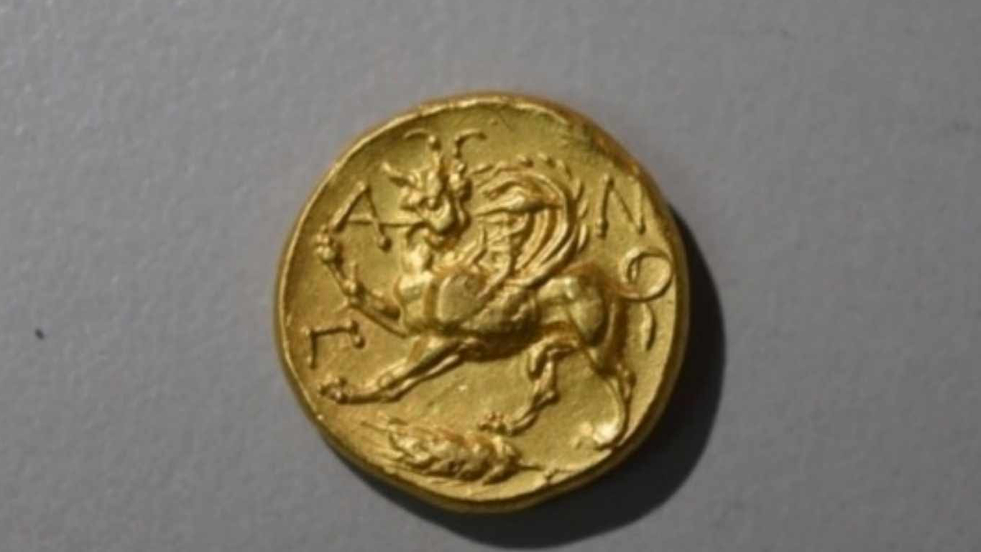 Πιο συγκεκριμένα, στα αρχαία αντικείμενα περιλαμβάνεται χρυσό νόμισμα αρχαίων χρόνων, του 4ου π.Χ. αιώνα με διάμετρο 17 χιλιοστά περίπου και βάρος τα 9,2 γραμμάρια. Το χρυσό αυτό νόμισμα, σύμφωνα με την εκτίμηση αρχαιολόγου του Νομισματικού Μουσείου Αθηνών, είναι ιδιαίτερα σπάνιο γιατί ο εικονιζόμενος «Πάνας» απεικονίζεται στην μπροστινή μορφή του και προέρχεται από την αρχαία πόλη της σημερινής Κριμαίας.