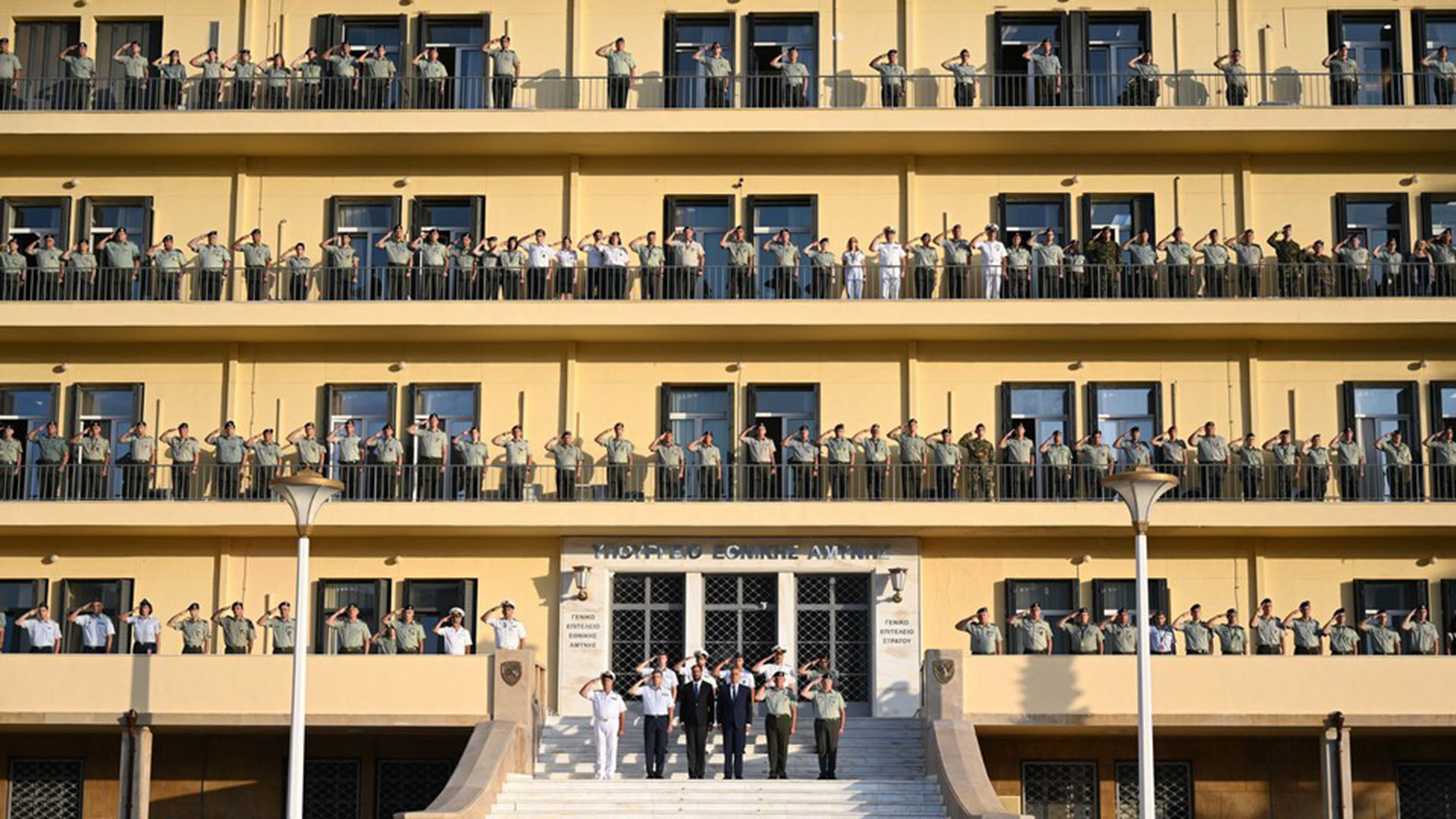 Ακίνητη και σιωπηλή, η πολιτική και στρατιωτική ηγεσία στάθηκε στην είσοδο του υπουργείου, ενώ σε όλα τα μπαλκόνια του κτιρίου στέκονταν στρατιωτικοί από όλα τα «όπλα» σε ένδειξη φόρου τιμής.