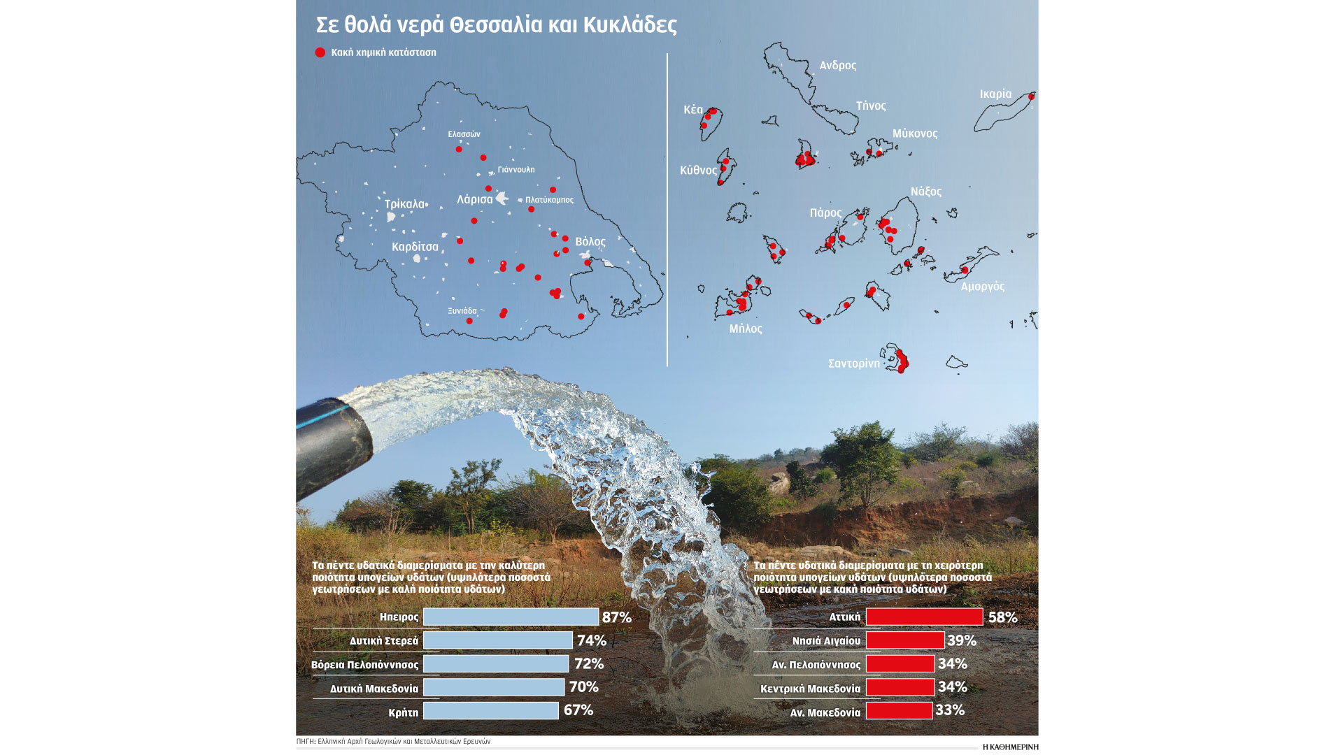 «Τα προβλήματα υποβάθμισης των ποσοτικών και ποιοτικών χαρακτηριστικών των υπογείων υδάτων συνεχίζουν να εντοπίζονται σε περιοχές με εντατική εκμετάλλευση των υδροφορέων. Η νιτρορρύπανση και η υφαλμύρινση των υπογείων υδάτων αποτελούν τους κύριους παράγοντες υποβάθμισής τους, που σχετίζονται, αντίστοιχα, με τη χρήση αζωτούχων λιπασμάτων και τη θαλάσσια διείσδυση λόγω υπεραντλήσεων. Ενα μικρό ποσοστό υπερβάσεων στις συγκεντρώσεις βαρέων μετάλλων/ιχνοστοιχείων και ιόντων χλωρίου οφείλεται σε φυσικά αίτια», σημειώνεται στην ανακοίνωση της ΕΑΓΜΕ. Οι δειγματοληψίες και οι αναλύσεις πραγματοποιούνται από την ΕΑΓΜΕ κάθε τρίμηνο ή εξάμηνο σε περίπου 600 υπόγεια υδατικά συστήματα. «Τα υπόγεια νερά είναι καλύτερα ποιοτικά και ποσοτικά στην Ηπειρο και στην Αιτωλοακαρνανία», εξηγεί στην «Κ» ο Βασίλης Ζόραπας, προϊστάμενος του Τμήματος Υδρογεωλογίας και Υδρολογίας της ΕΑΓΜΕ και επιστημονικός υπεύθυνος του έργου. «Αντιθέτως, τα μεγαλύτερα προβλήματα παρατηρούνται στην Κεντρική και Ανατολική Ελλάδα και ιδίως στη Θεσσαλία, στην Αργολίδα και στα νησιά του Αιγαίου εξαιτίας της υπεράντλησης των υδάτων και της νιτρορρύπανσης». Ας δούμε ορισμένα παραδείγματα: