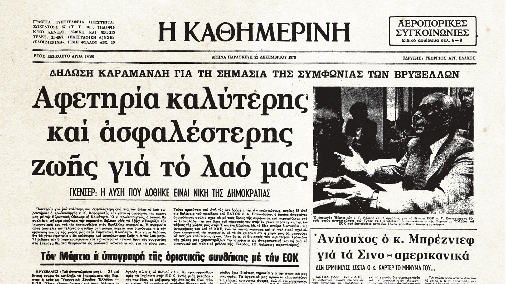«Αφετηρία για μια καλύτερη και ασφαλέστερη ζωή για τον ελληνικό λαό χαρακτήρισε ο πρωθυπουργός κ. Κ. Καραμανλής την χθεσινή συμφωνία της χώρας μας με την Ευρωπαϊκή Οικονομική Κοινότητα. Ο κ. πρωθυπουργός, ο οποίος θα σχολιάσει σήμερα ευρύτερα την συμφωνία, δήλωσε χθες τα εξής: “Εκφράζω την ικανοποίησή μου για την επιτευχθείσα στις Βρυξέλλες συμφωνία. Η συμφωνία αυτή αποτελεί τον τελευταίο σταθμό στη μακρά πορεία που διανύσαμε για την οργανική ένταξη της χώρας μας στην Ευρωπαϊκή Κοινότητα. Και είμαι βέβαιος ότι θα γίνει αφετηρία μιας καλύτερης και ασφαλέστερης ζωής για τον λαό μας”. Η έκβαση των διαπραγματεύσεων και ειδικότερα οι τελικοί όροι της συμφωνίας στα επίμαχα θέματα θεωρούνται ως απόλυτα ικανοποιητικοί για τη χώρα μας», έγραφε στο πρωτοσέλιδό της η «Καθημερινή» την επομένη της λήξης των διαπραγματεύσεων.