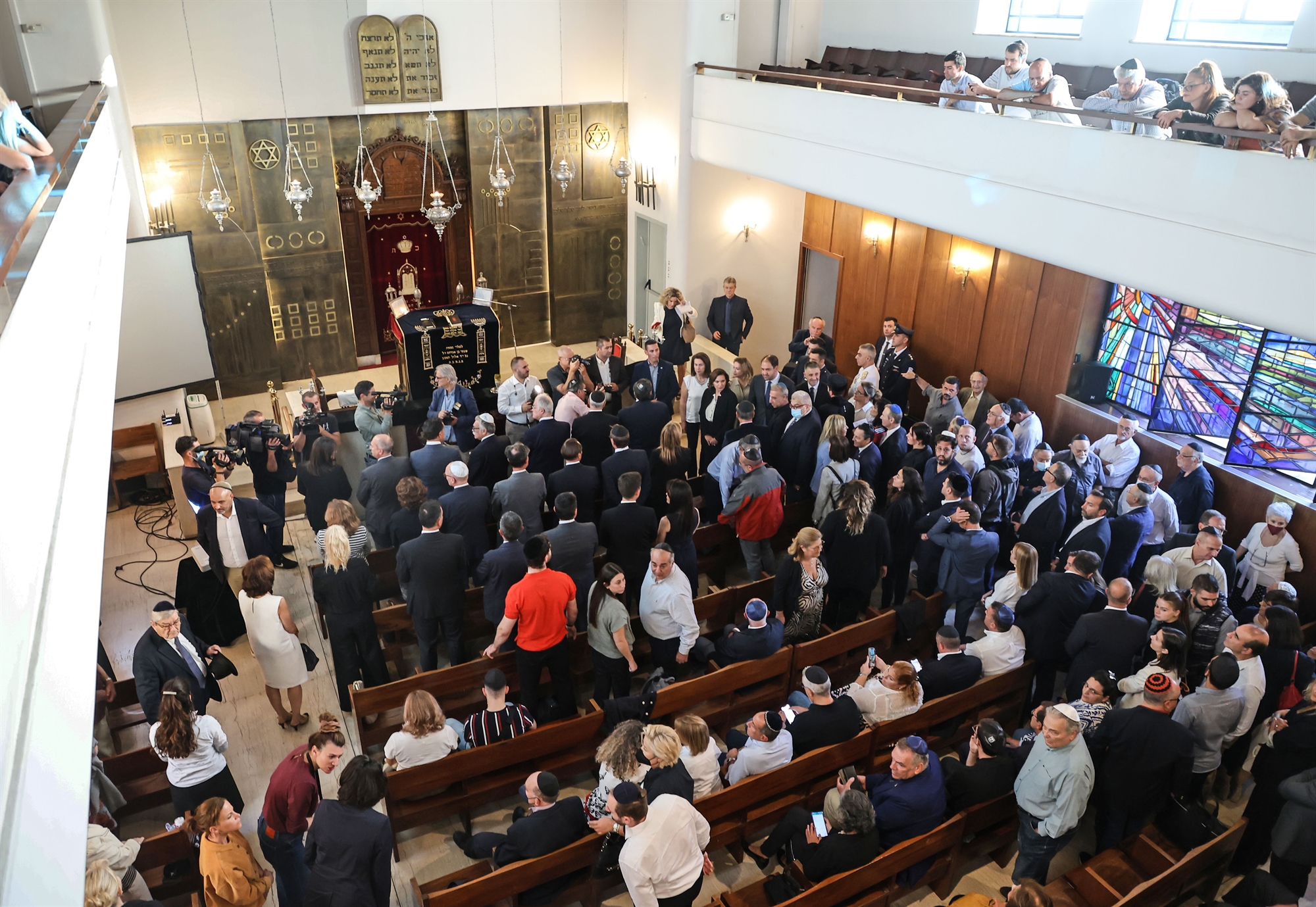 Το κλίμα μέσα στη συναγωγή, στην οποία παρευρέθησαν μεταξύ άλλων μελών της κυβέρνησης ο πρόεδρος της Βουλής Κωνσταντίνος Τασούλας, ο υπουργός Εργασίας Αδωνις Γεωργιάδης και η υπουργός Εσωτερικών Νίκη Κεραμέως, όπως και ο πρέσβης του Ισραήλ στην Ελλάδα Νόαμ Κατς, αλλά και ο πρέσβης των ΗΠΑ στη χώρα μας Τζορτζ Τσούνης, ήταν βαρύ.