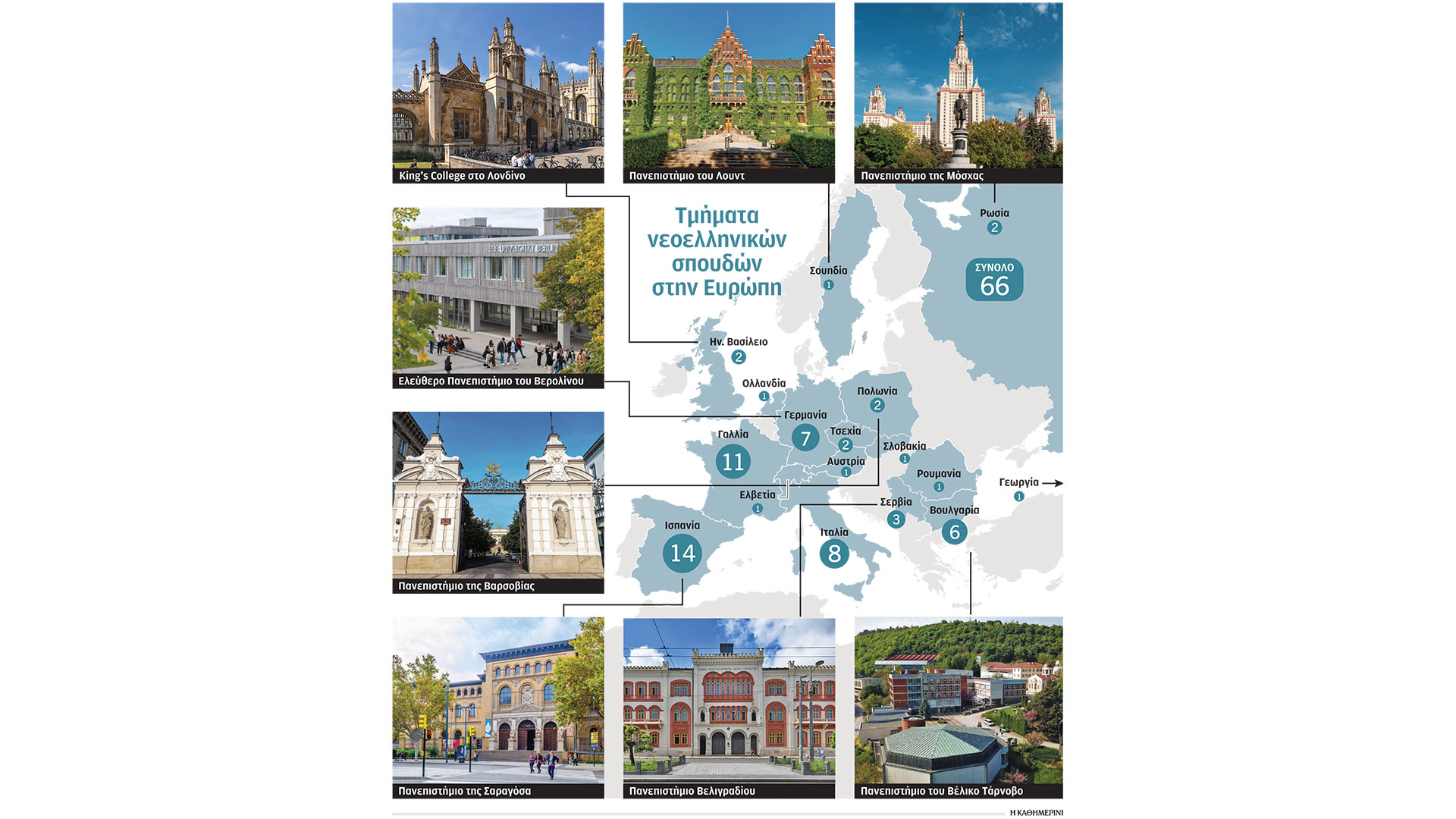 Ο κατάλογος της Ευρωπαϊκής Εταιρείας Νεοελληνικών Σπουδών δείχνει 66 τμήματα νεοελληνικών σπουδών σε 17 χώρες της Ευρώπης. Συνήθως οι νεοελληνικές σπουδές εκτός Ελλάδος εντάσσονται σε μεγαλύτερα τμήματα του πανεπιστημίου. Ανάλογα με την παράδοση κάθε χώρας και κάθε πανεπιστημίου, αλλά και το υπάρχον δυναμικό, οι νεοελληνικές σπουδές συνδυάζονται με τις κλασικές, τις βυζαντινές, την ιστορία, την πολιτική επιστήμη κ.ά. Ωστόσο, πολλά από αυτά στηρίζονται σε ελάχιστους ανθρώπους – κάποια έχουν μόνον ένα μόνιμο διδάσκοντα. Παράλληλα, πολλά πανεπιστημιακά τμήματα σε Ευρώπη, ΗΠΑ, Καναδά και αλλού χρησιμοποιούν αποσπασμένους εκπαιδευτικούς για τη διδασκαλία της γλώσσας. Αυτή η διαδικασία συντονίζεται από το ελληνικό υπουργείο Παιδείας. Ο κίνδυνος αυτού του είδους της υποστήριξης είναι πως όταν σταματήσει ο ελληνικός φορέας να χρηματοδοτεί, το πανεπιστήμιο δεν καλύπτει το κενό και χάνεται έτσι η θέση. Και τα τελευταία χρόνια υπάρχουν πολλές συνταξιοδοτήσεις πανεπιστημιακών.