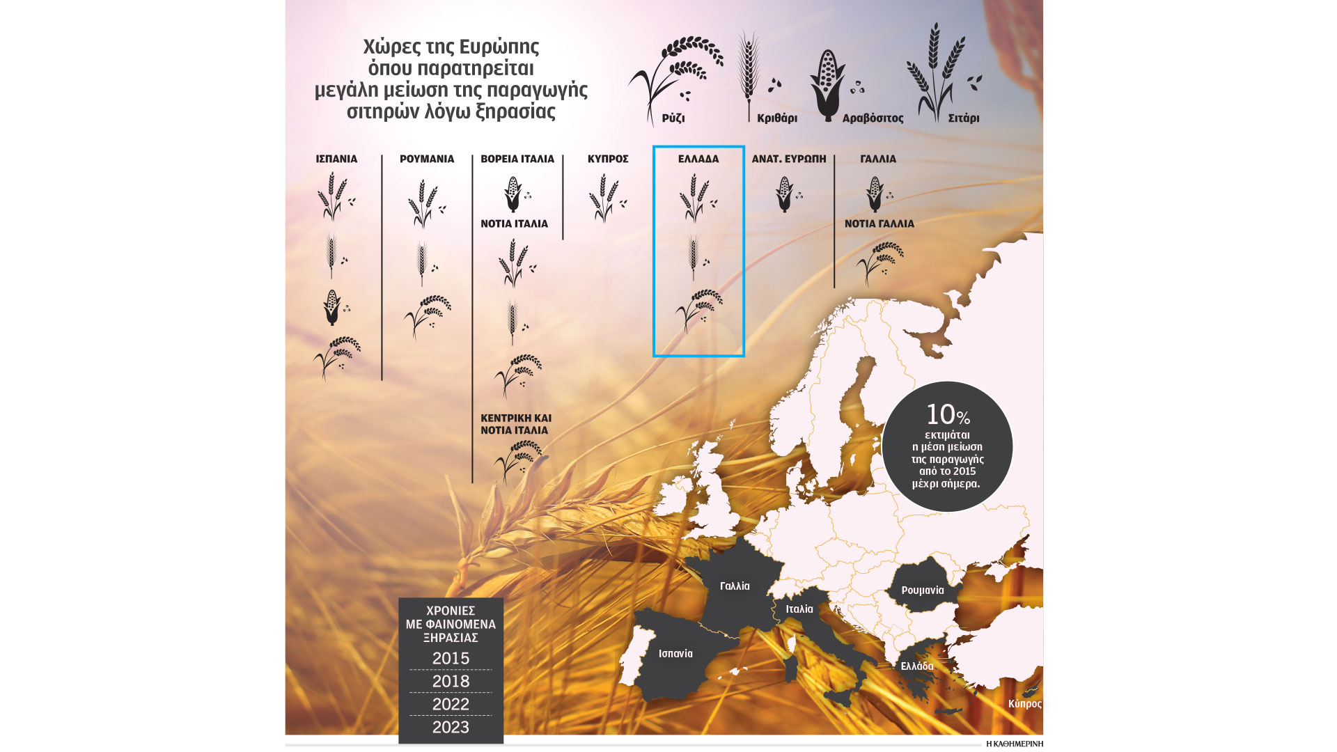 Στην καλλιέργεια κριθαριού, οι χώρες που, με βάση τα έως τώρα καταγεγραμμένα στοιχεία, φαίνεται να έχουν τις μεγαλύτερες απώλειες είναι η Ρουμανία και η Ιταλία, ωστόσο και οι απώλειες για την Ελλάδα ετησίως φτάνουν στο 7,5%. Εφόσον η θερμοκρασία αυξηθεί κατά 3 βαθμούς, οι απώλειες της παραγωγής αναμένεται να διπλασιαστούν. Οσον αφορά το ρύζι, η Ελλάδα βρίσκεται ανάμεσα στις πέντε χώρες που θα πληγούν περισσότερο λόγω της ξηρασίας, ενώ ήδη καταγράφεται μια πτώση της παραγωγής σε ποσοστό 10%. Υπενθυμίζεται πως η παραγωγή ρυζιού χρειάζεται περιοχές με πολύ νερό και υγρασία, οπότε πρόκειται για μια καλλιέργεια που θα πληγεί ιδιαίτερα από την ξηρασία.