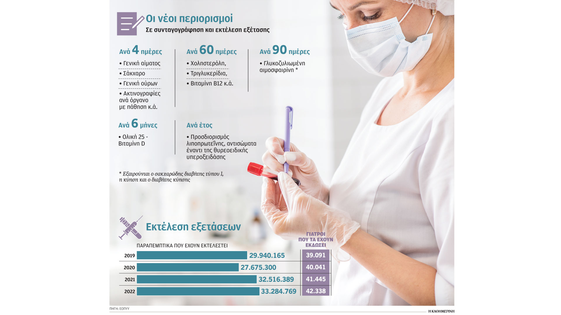 Νέους «κόφτες» στη συχνότητα με την οποία μπορούν να εκτελούνται στα ιδιωτικά διαγνωστικά κέντρα και εργαστήρια εξετάσεις για τους ασφαλισμένους, εφαρμόζει πλέον ο ΕΟΠΥΥ. Σε μια προσπάθεια αντιμετώπισης φαινομένων καταχρηστικής συνταγογράφησης και εξορθολογισμού της ζήτησης των διαγνωστικών εξετάσεων που το 2022 κοστολογήθηκε για τον ΕΟΠΥΥ σύμφωνα με υπολογισμούς στα 640 εκατ. ευρώ, ενεργοποιήθηκαν στο σύστημα ηλεκτρονικής συνταγογράφησης μέτρα ελέγχου της συνταγογράφησης και εκτέλεσης εργαστηριακών εξετάσεων. Τα μέτρα αυτά ξεκινούν με χαρακτηριστική καθυστέρηση αφού η υπουργική απόφαση στην οποία βασίζονται είχε υπογραφεί τον Σεπτέμβριο του 2022. Σύμφωνα με αυτά, συγκεκριμένες εργαστηριακές εξετάσεις όπως π.χ. η γενική ούρων, αίματος, χολερυθρίνης, ακτινογραφίες ανά όργανο με πάθηση κ.ά. μπορούν να γίνονται το συχνότερο ανά 4 ημέρες (για κάποιες από αυτές ο «κόφτης» των 4 ημερών ίσχυε και πριν, αλλά με περιθώριο παράκαμψής του), εξετάσεις όπως βιταμίνη Β12, ο προσδιορισμός φυλλικού οξέος, τριγλυκερίδια αίματος, χοληστερόλη το συχνότερο ανά 60 ημέρες, η γλυκοζυλιωμένη αιμοσφαιρίνη (με εξαιρέσεις) ανά 90 ημέρες, εξετάσεις για τη βιταμίνη D και την D3 ανά έξι μήνες, ενώ υπάρχουν και εξετάσεις που θα πρέπει να γίνονται με συχνότητα ανά έτος.