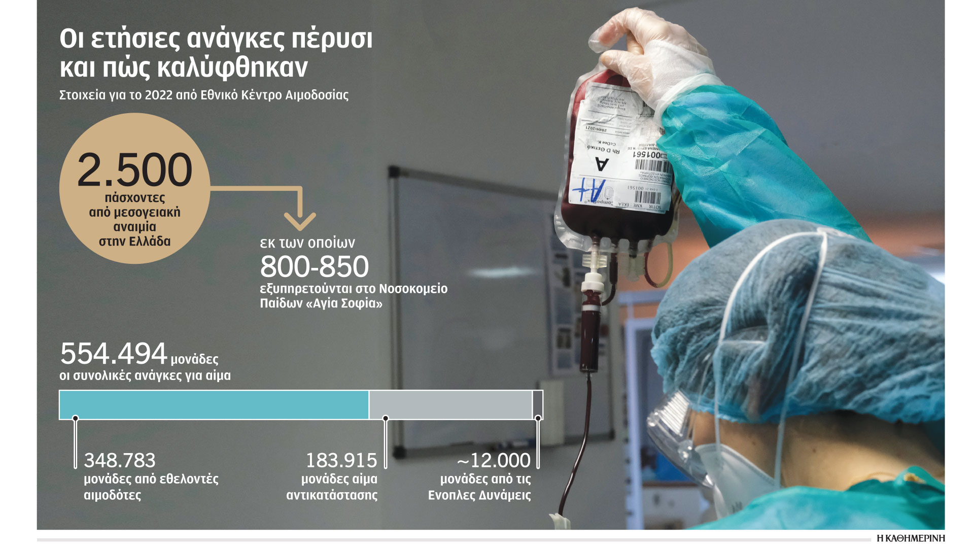 Στην Ελλάδα υπολογίζεται πως γύρω στους 2.500 ασθενείς με μεσογειακή αναιμία χρειάζονται τακτική παροχή αίματος. Από αυτούς, περίπου οι 800 εξυπηρετούνται στο νοσοκομείο Παίδων «Αγία Σοφία», που δέχεται τον μεγαλύτερο όγκο πανελλαδικά. «Ενας ενήλικος πάσχων, εάν όλα πάνε καλά, χρειάζεται δύο μεταγγίσεις τον μήνα, ανά 15 ημέρες να λάβει 500-550 ml αίμα. Οταν υπάρχει έλλειψη παίρνουμε μία φιάλη και πάμε έπειτα από μία εβδομάδα ή και 8-10 ημέρες. Με τη μία όμως μονάδα δεν ανεβαίνει ο αιματοκρίτης στο επίπεδο που χρειάζεται και εσύ “σέρνεσαι”. Δεν μπορείς να είσαι λειτουργικός στη δουλειά σου και σε ό,τι κάνεις, ενώ και ο οργανισμός σου είναι αποδυναμωμένος και μπορεί να εμφανιστούν και άλλα προβλήματα υγείας», εξηγεί ο κ. Πανέτας.