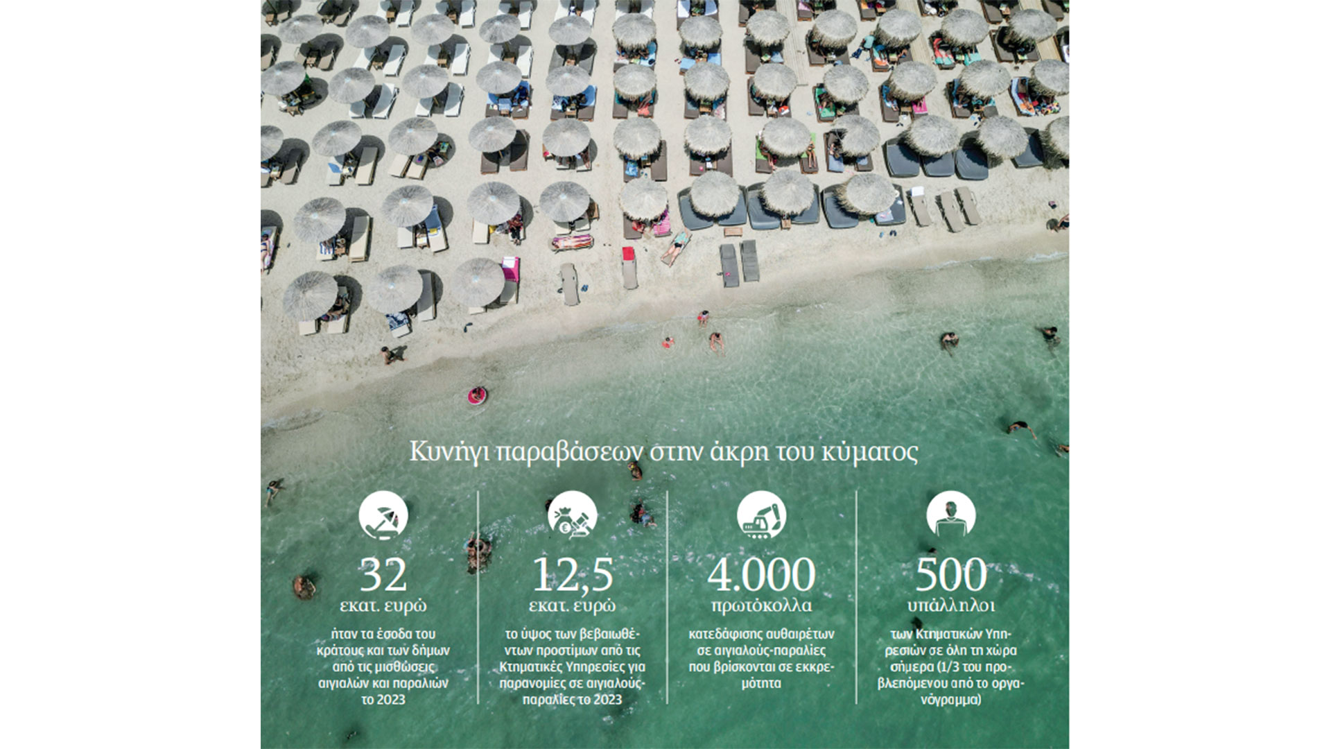 «Κάναμε ό,τι καλύτερο μπορούσαμε. Ανακαλέσαμε άδειες υπαλλήλων, ενισχύσαμε τις πιο κρίσιμες υπηρεσίες όπως των Κυκλάδων και της Χαλκιδικής με υπαλλήλους από άλλες, αρχίσαμε συστηματικές αυτοψίες και οι υπάλληλοι των κτηματικών υπηρεσιών ανταποκρίθηκαν στο μέγιστο δυνατό. Σε λιγότερο από δύο μήνες διενεργήσαμε 4.500 ελέγχους και καταγράψαμε 1.750 παραβάσεις. Τα έσοδα από τις παραχωρήσεις αιγιαλών για το κράτος και τους δήμους το 2023 ήταν περίπου 32 εκατ. ευρώ και τα πρόστιμα που έχουν βεβαιωθεί μέχρι στιγμής φθάνουν περίπου τα 12,5 εκατ. ευρώ – και δεν έχουμε τελειώσει», λέει η κ. Κόλλια. «Υπάρχουν όμως και προβλήματα που κάποιος δεν τα φαντάζεται. Για παράδειγμα, οι υπάλληλοι των κτηματικών υπηρεσιών δεν νομιμοποιούνται να διενεργούν αυτοψίες τα Σαββατοκύριακα, γιατί η εργασία τους είναι πενθήμερη και όχι επταήμερη, όπως των ενστόλων. Υπάρχει ο αστάθμητος παράγοντας των δήμων, που δεν έχουν μεν άμεση αρμοδιότητα, αλλά οφείλουν να ελέγχουν τις παραχωρήσεις και να ενημερώνουν τις κτηματικές υπηρεσίες να ανακαλούν άδειες σε παρανομούντες και να απομακρύνουν τα παράνομα ομπρελοκαθίσματα εφόσον τους ζητηθεί από τις κτηματικές. Αν ένας δήμος δεν μπορεί ή δεν θέλει, εμείς δεν έχουμε τρόπο να τον υποχρεώσουμε. Υπάρχουν και τα ζητήματα των “αυτοφωράκηδων”, των μπράβων που απειλούν τους υπαλλήλους μας, των Αποκεντρωμένων Διοικήσεων που δεν έχουν διενεργήσει κατεδαφίσεις για πολλούς λόγους και ένα σωρό “τρύπες” στο σύστημα, τις οποίες θα προσπαθήσουμε να κλείσουμε».