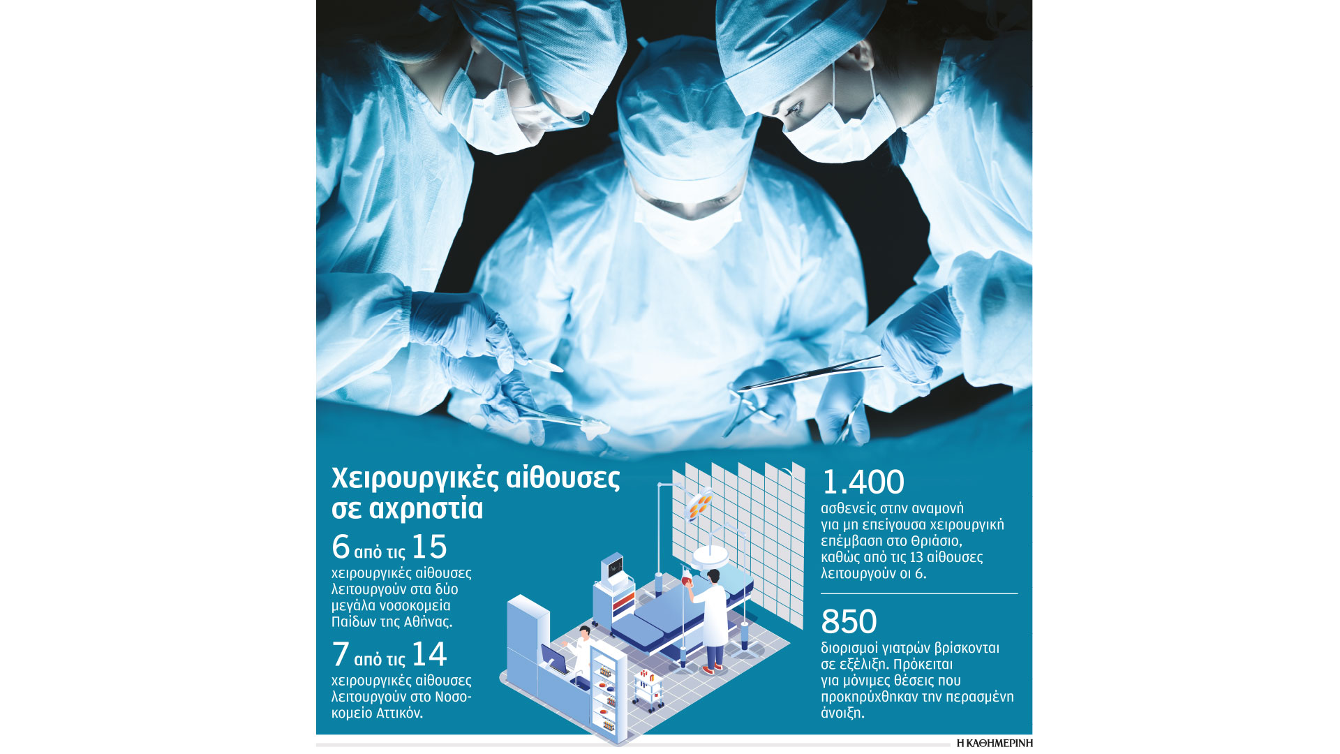 Ειδικότερα, στο νοσοκομείο Αττικόν έχουν αναπτυχθεί 14 χειρουργικές αίθουσες, εκ των οποίων λειτουργούν οι μισές. Στα δύο μεγάλα νοσοκομεία Παίδων της Αθήνας λειτουργούν μόλις έξι αίθουσες, από τις 15 συνολικά. Στον «Ευαγγελισμό» λειτουργούν 13-14 χειρουργικές αίθουσες από τις 17 που διαθέτει το νοσοκομείο, με την κάλυψη από αναισθησιολόγους, νοσηλευτικό προσωπικό και τραυματιοφορείς να είναι οριακή. Για τον ίδιο λόγο, κλειστά είναι στο Κοργιαλένειο Μπενάκειο ΕΕΣ δύο χειρουργικά τραπέζια από τα εννέα ανεπτυγμένα που διαθέτει το νοσοκομείο. Στο Ασκληπιείο Βούλας, τέσσερις χειρουργικές αίθουσες είναι κλειστές, στο Τζάνειο έξι, στο «Αγία Ολγα» δύο, όπως και στο «Μεταξά» και στο Σισμανόγλειο. Στον αντίποδα, με όλες τους τις δυνάμεις λειτουργούν τα χειρουργεία στα νοσοκομεία «Γ. Γεννηματάς» (20 χειρουργικές αίθουσες), «Αγιος Σάββας» (10 χειρουργικές αίθουσες), Λαϊκό, Ιπποκράτειο, «Αλεξάνδρα», Γενικό Ογκολογικό Αγίων Αναργύρων και ΝΙΜΤΣ.