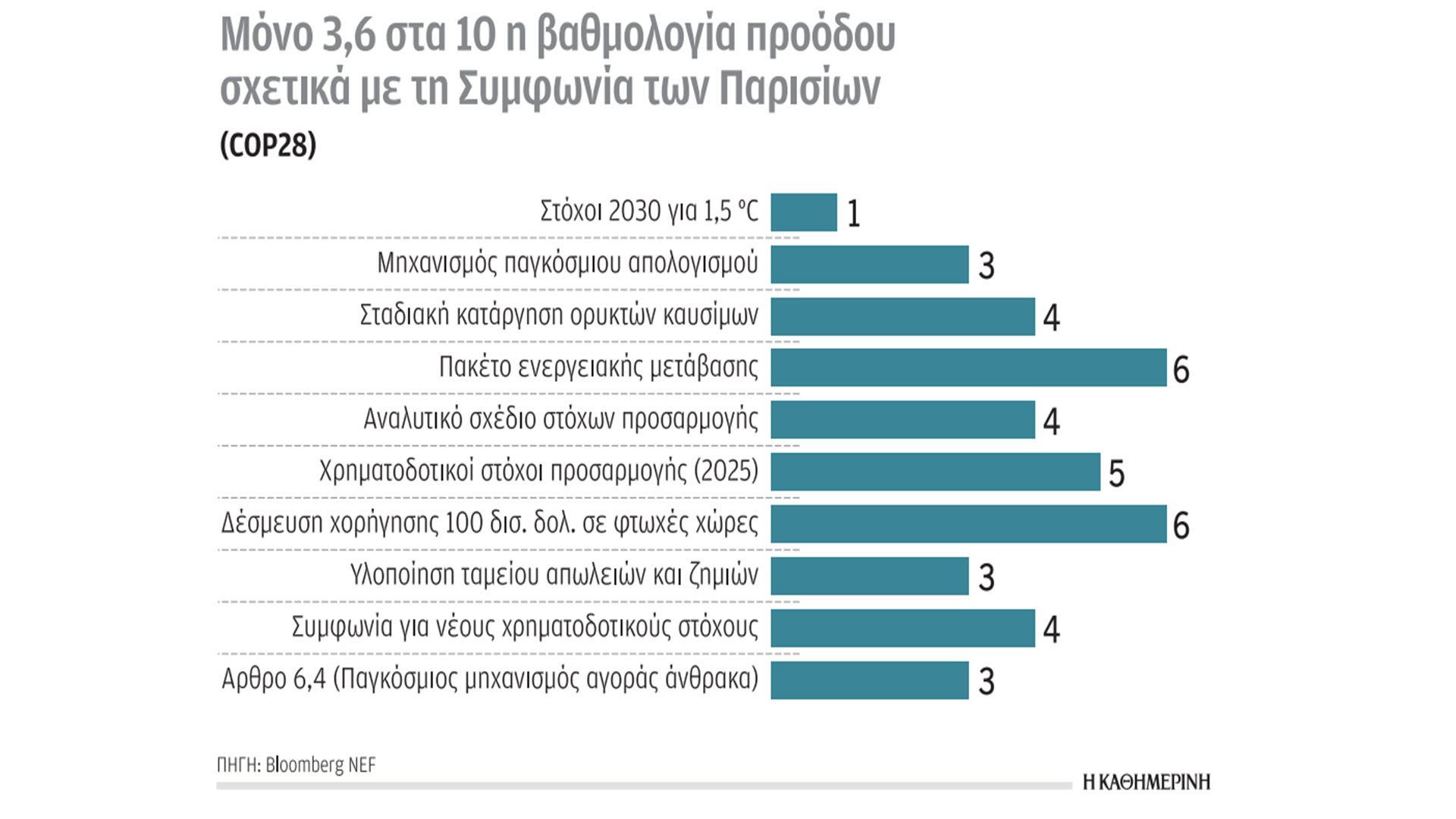Πολύ κάτω από τη βάση (3,6 στα 10) θα βαθμολογήσει η Παγκόσμια Διάσκεψη του ΟΗΕ για το Κλίμα την επίτευξη των 10 βασικών στόχων της Συμφωνίας των Παρισίων. Οι χειρότερες επιδόσεις παρουσιάζονται στους στόχους για το 2030 (1/10), ενώ με 3/10 βαθμολογείται η υλοποίηση του Ταμείου Απωλειών και Ζημιών, του Μηχανισμού Παγκόσμιου Απολογισμού και του άρθρου 6.4 της COP21 για τον Παγκόσμιο Μηχανισμό Αγοράς Ανθρακα. Τις μεγαλύτερες βαθμολογίες (6/10) επιτυγχάνουν το πακέτο Ενεργειακής Μετάβασης και η δέσμευση για $100 δισ./έτος για τη Χρηματοδότηση Αναδυόμενων και Αναπτυσσόμενων Οικονομιών.