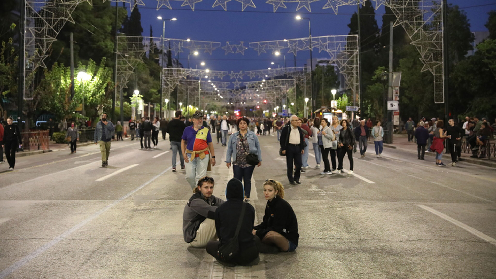 Διαδηλωτές κάθονται στη μέση του δρόμου, κατά τη διάρκεια της πορείας για την εξέγερση του Πολυτεχνείου.