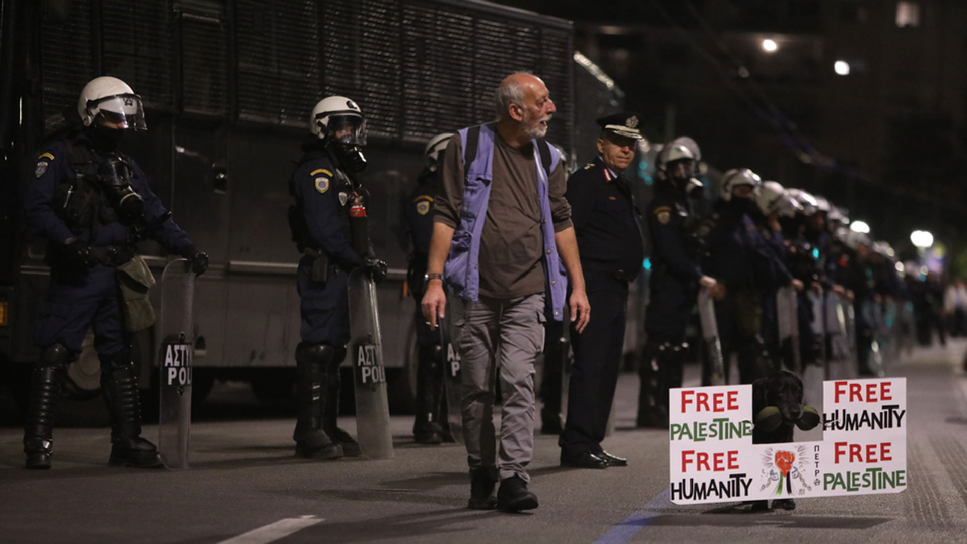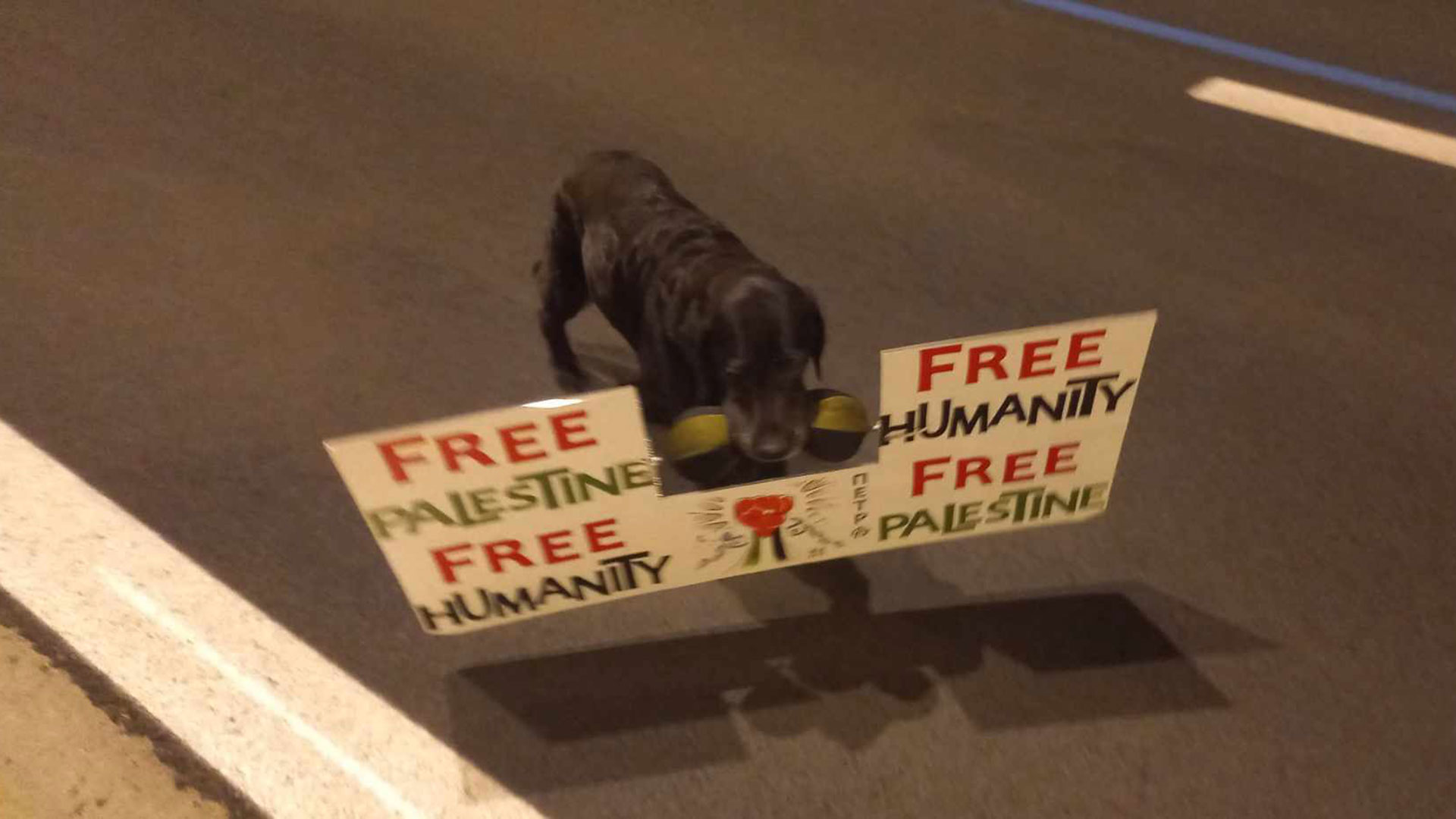 Σκύλος, κατά τη διάρκεια της διαδήλωσης, κρατάει στο στόμα του πλακάτ με σύνθημα: «Ελεύθερη Παλαιστίνη, ελεύθερη ανθρωπότητα».