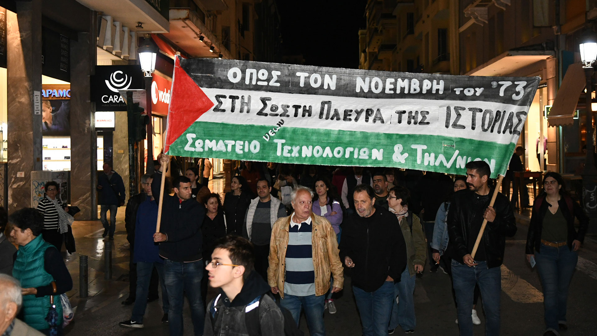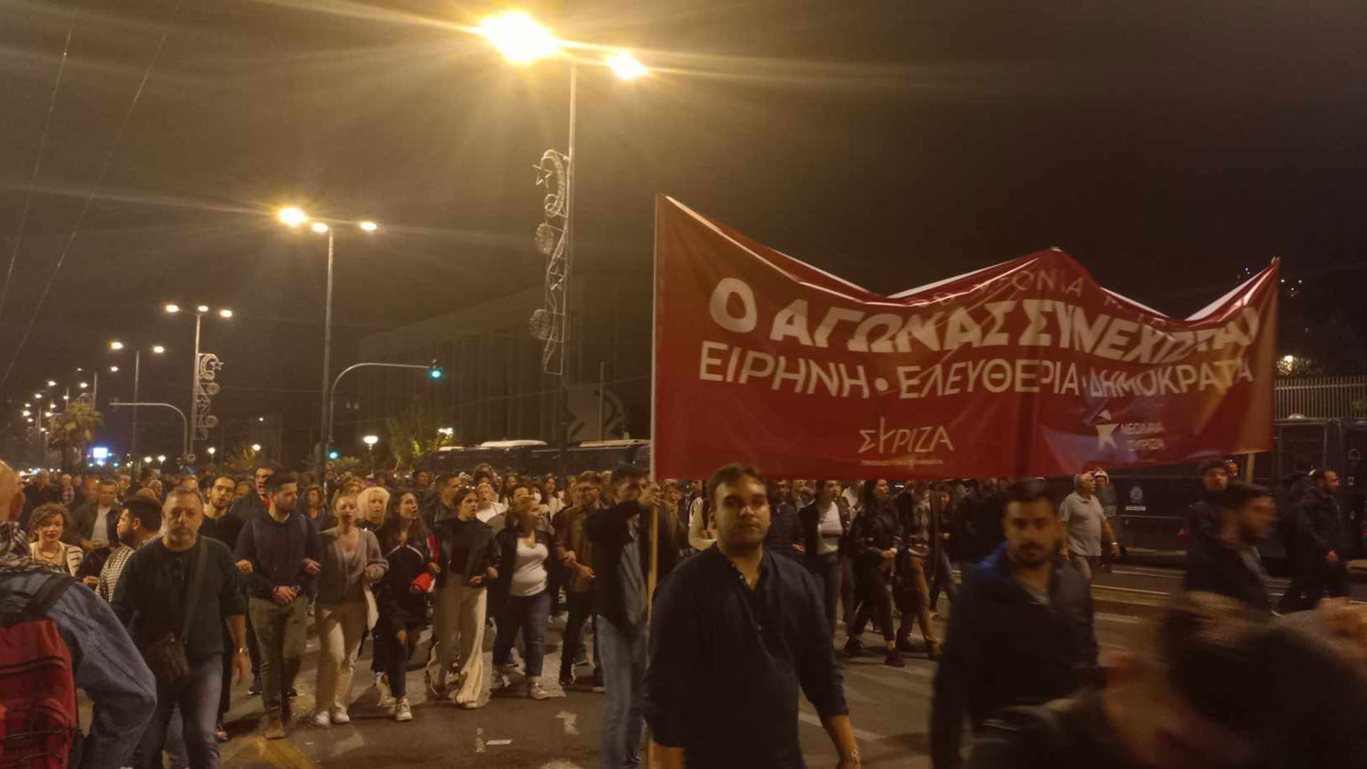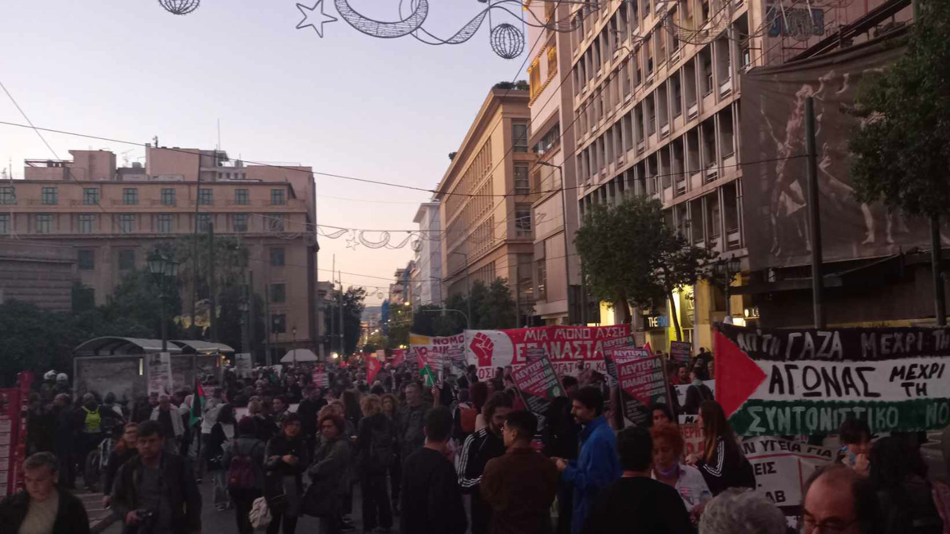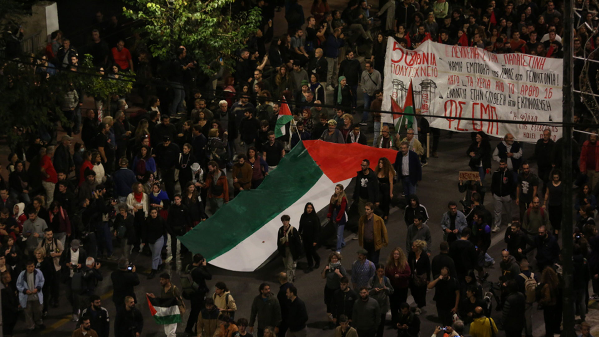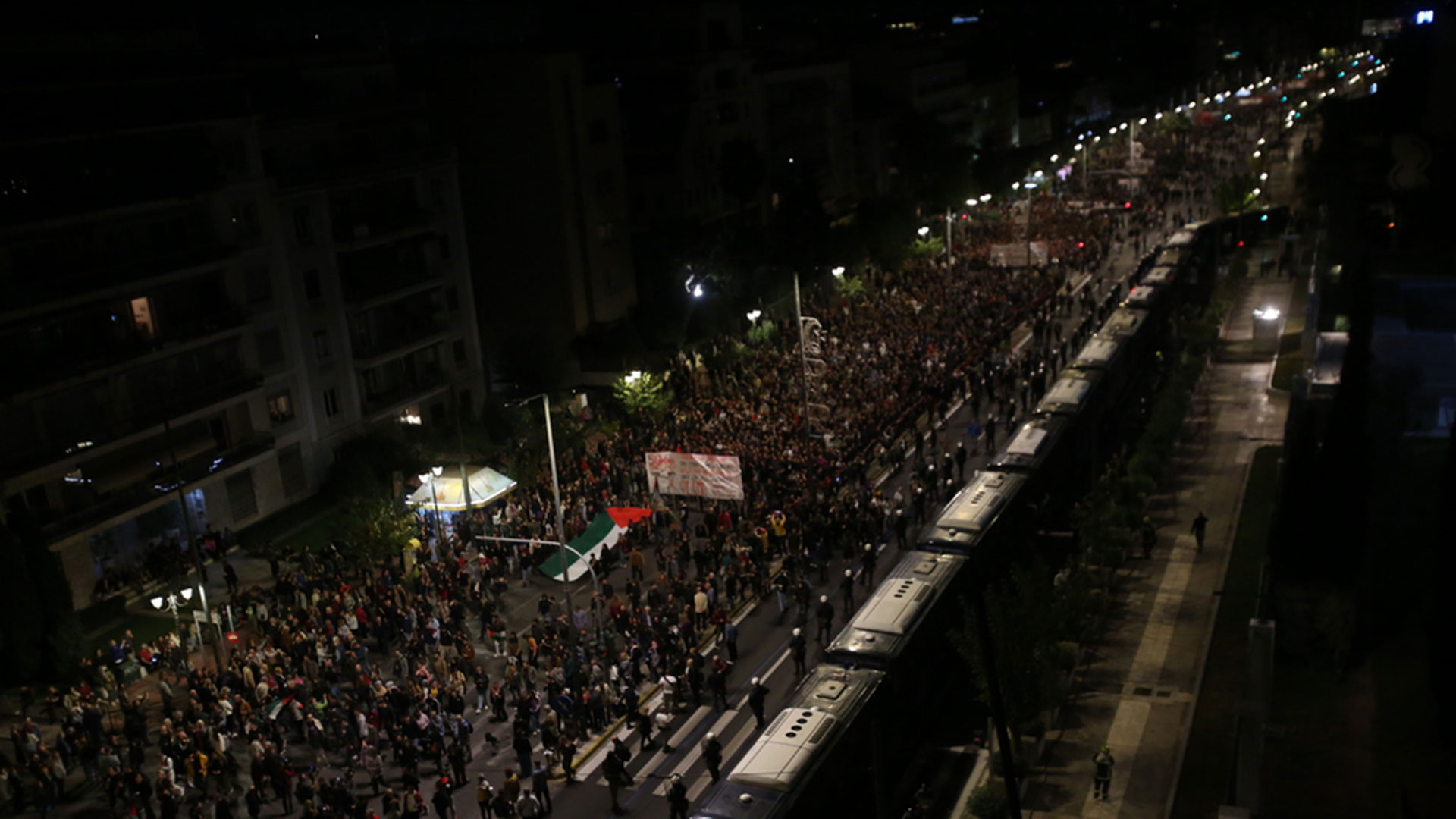 Πλήθος κόσμου, μεταξύ των οποίων φοιτητικοί σύλλογοι και κόμματα της εξωκοινοβουλευτικής αριστεράς, συνεχίζει με κατεύθυνση την πρεσβεία του Ισραήλ, για να διαμαρτυρηθεί για τον πόλεμο στη Γάζα.