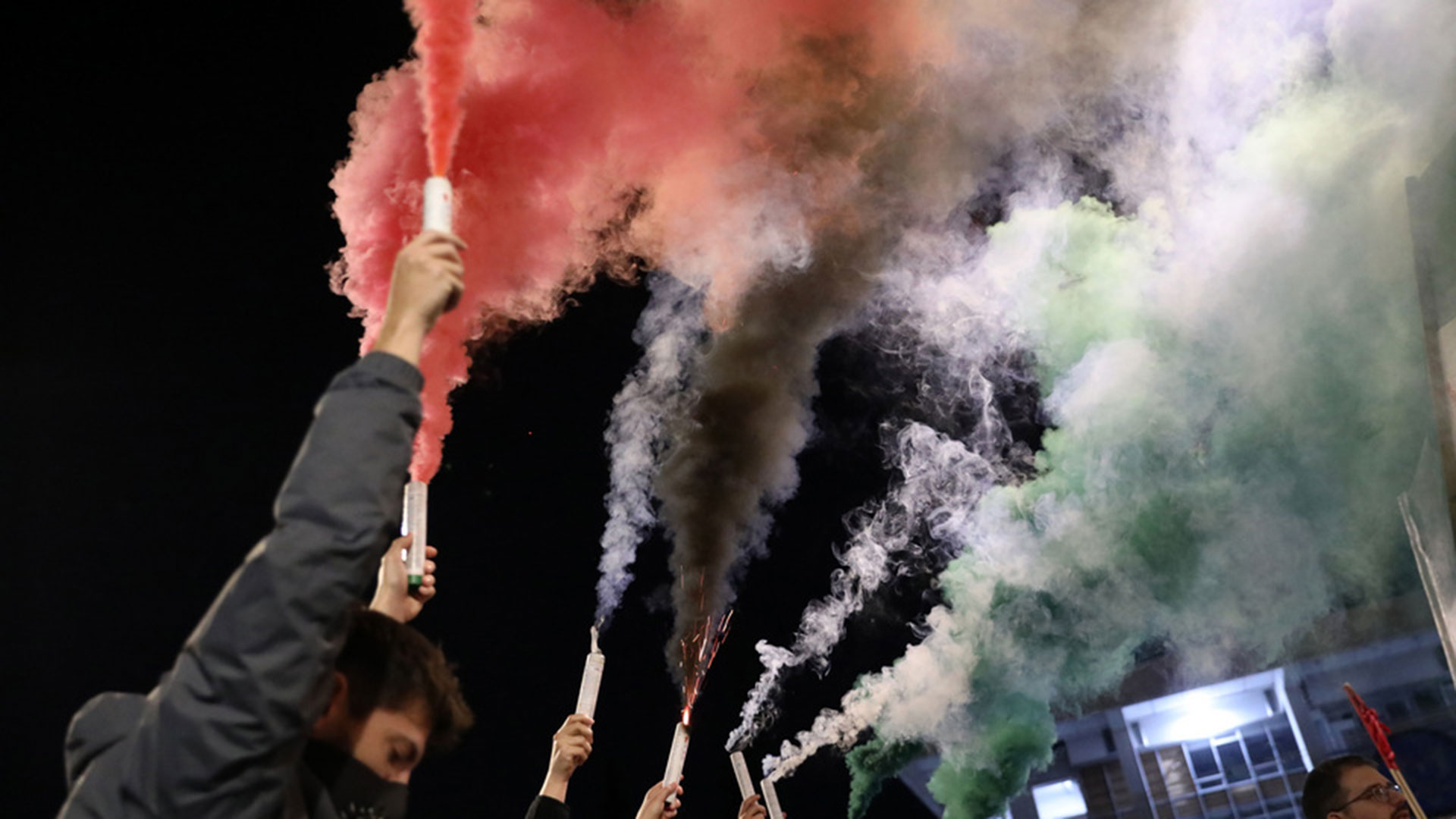Διαδηλωτές κρατούν καπνογόνα με τα χρώματα της σημαίας της Παλαιστίνης.