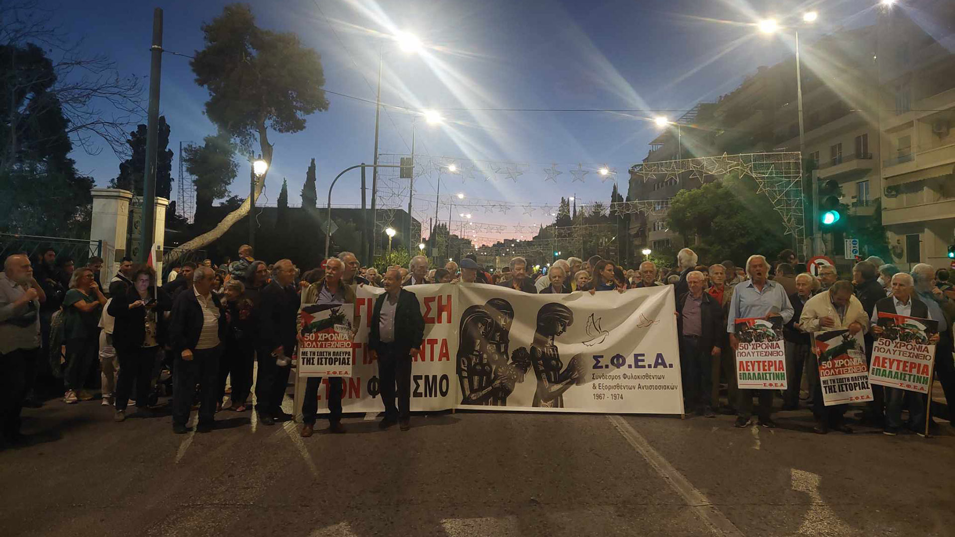 Εξω από την πρεσβεία του Ισραήλ έφθασε νωρίτερα, τμήμα του κόσμου που συμμετείχε στην πορεία για την 50η επέτειο της εξέγερσης του Πολυτεχνείου, στο πλαίσιο διαμαρτυρίας για την κατάσταση στη Γάζα.