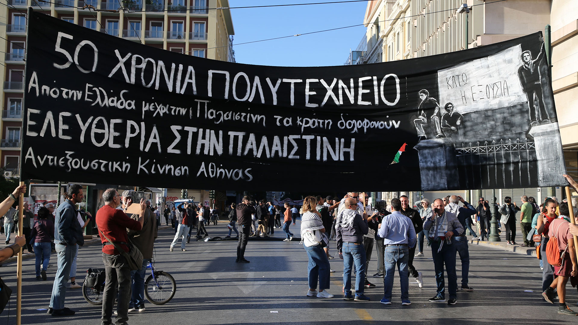 Σύμφωνα με την ΕΡΤ, οι διαδηλωτές κρατούν πανό και φωνάζουν συνθήματα για το Πολυτεχνείο αλλά και αλληλεγγύης στην Παλαιστίνη. Σύμφωνα με την ΕΛ.ΑΣ. στις κινητοποιήσεις συμμετέχουν συνολικά περίπου 11.000 πολίτες.