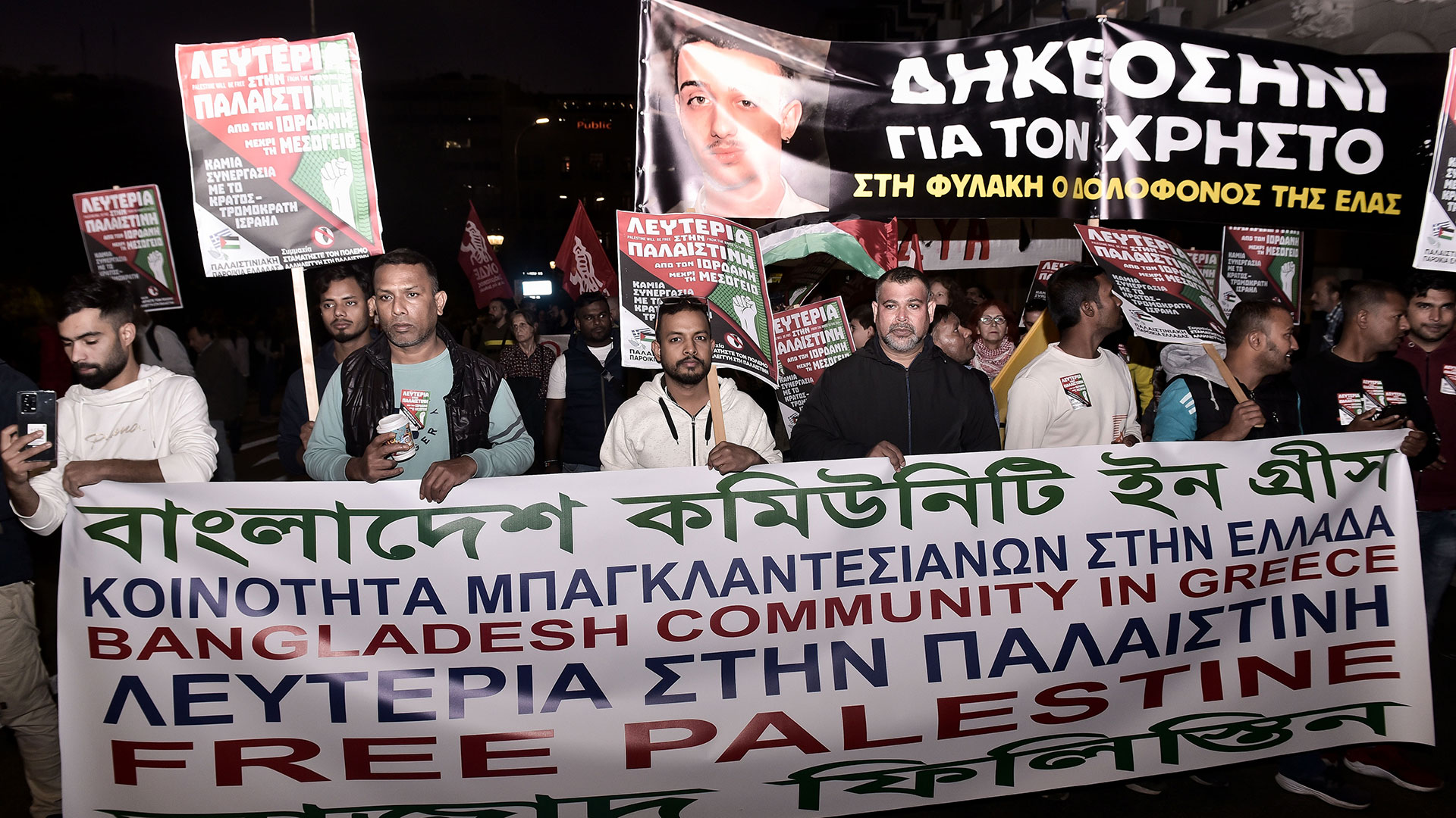 Πολλές είναι οι σημαίες της Παλαιστίνης καθώς και τα συνθήματα για τον πόλεμο στη Γάζα.