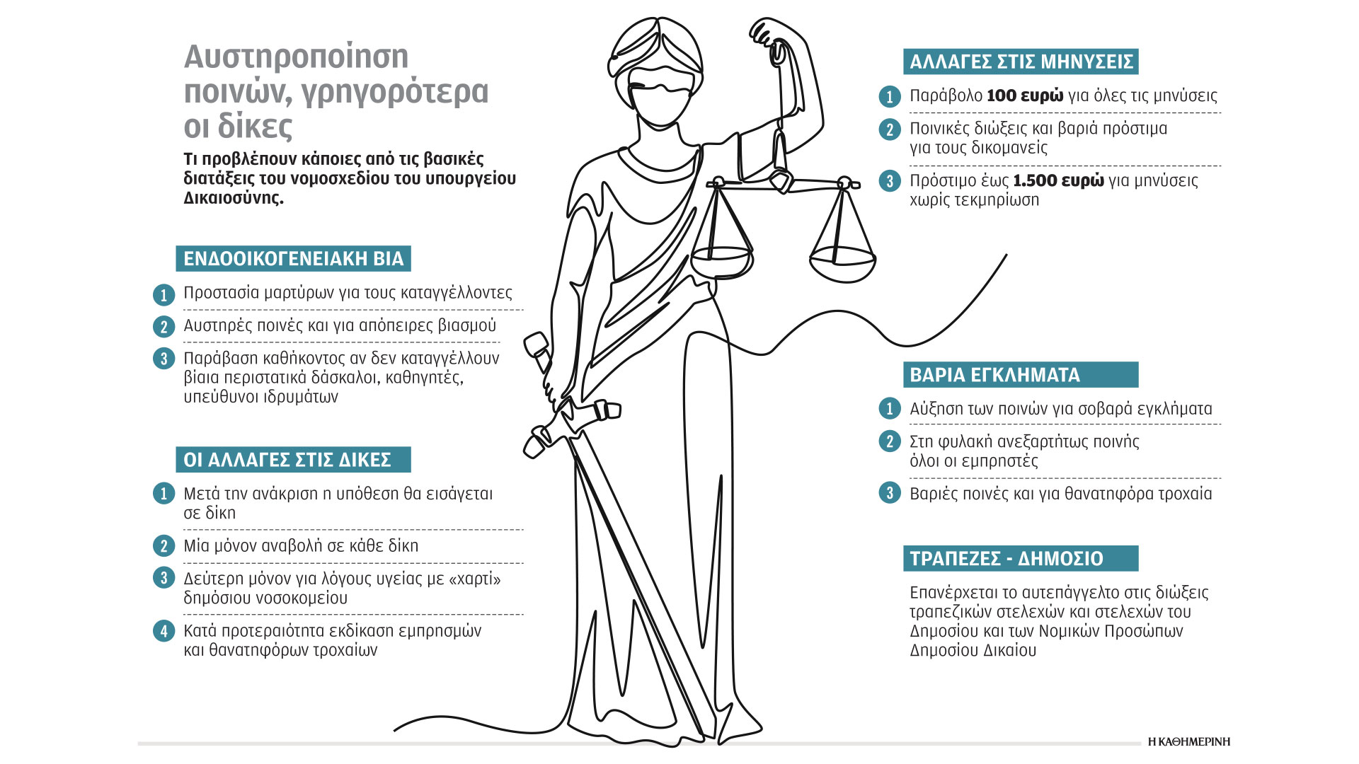 Αυστηροποίηση ποινών σε πολλά εγκλήματα, όπως οι εμπρησμοί και τα βαριά τροχαία, επιτάχυνση των δικαστικών διαδικασιών και μέτρα για την άμβλυνση του αισθήματος ατιμωρησίας που είναι διάχυτο στην κοινωνία, επιχειρεί η κυβέρνηση με το νομοσχέδιο του υπουργείου Δικαιοσύνης. Ο αρμόδιος υπουργός, Γιώργος Φλωρίδης, παρουσίασε τις βασικές διατάξεις του, ενώ εξήγγειλε ότι επανέρχεται το αυτεπάγγελτο στις διώξεις τραπεζικών στελεχών και στελεχών του Δημοσίου και των Νομικών Προσώπων Δημοσίου Δικαίου που είχε καταργηθεί, κίνηση που είχε επικριθεί. Για την επαναφορά του αυτεπάγγελτου είχε κάνει λόγο ο ίδιος ο κ. Φλωρίδης πολλές φορές στη Βουλή, εκφράζοντας, όπως είχε υποστηρίξει αρχικά, προσωπική του θέση, ενώ χθες σημείωσε ότι για την επαναφορά της είναι σύμφωνος ο πρωθυπουργός, αλλά και το υπουργικό συμβούλιο. Παράλληλα, αναφέρθηκε και στις νέες ρυθμίσεις για την έκτιση των ποινών, αφού στο εξής όλες οι ποινές πάνω από τρία χρόνια θα εκτίονται, εξαγγέλλοντας την ίδρυση νέων φυλακών που θα φιλοξενούν τους καταδικασθέντες σε μικρές ποινές.