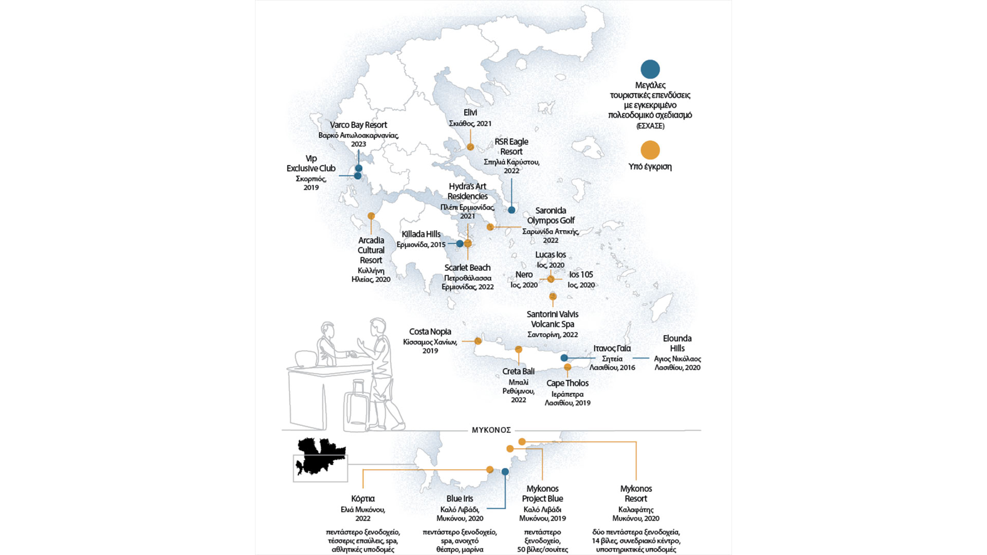 Τα τελευταία χρόνια, οι προτάσεις για μεγάλες τουριστικές εγκαταστάσεις στη Μύκονο κατατίθενται η μια πίσω από την άλλη. Μέχρι στιγμής μία στρατηγική επένδυση έχει ολοκληρώσει τη διαδικασία με την έγκριση ειδικού σχεδίου χωρικής ανάπτυξης στρατηγικής επένδυσης (ΕΣΧΑΣΕ): πρόκειται για τη μονάδα Blue Iris, συμφερόντων της εταιρείας AGC Partners. Η συγκεκριμένη επένδυση ξεκίνησε την πορεία της το 2019 με την ένταξή της στο καθεστώς των στρατηγικών επενδύσεων, ενώ τον Ιούνιο του 2020 εγκρίθηκε το ΕΣΧΑΣΕ με προεδρικό διάταγμα. Ακολούθως, τον Ιανουάριο του 2022 το επενδυτικό σχέδιο έλαβε έγκριση χωροθέτησης.