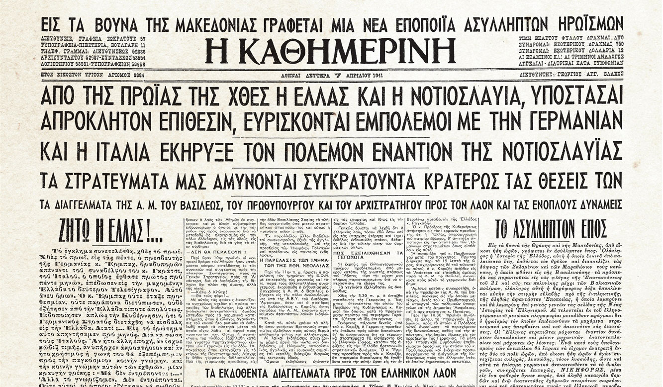 Με αυτόν τον λιτό τίτλο, ανακοινώνει η «Καθημερινή» στις 7 Απριλίου 1941 την έναρξη της γερμανικής εισβολής που έλαβε χώρα την προηγούμενη ημέρα.