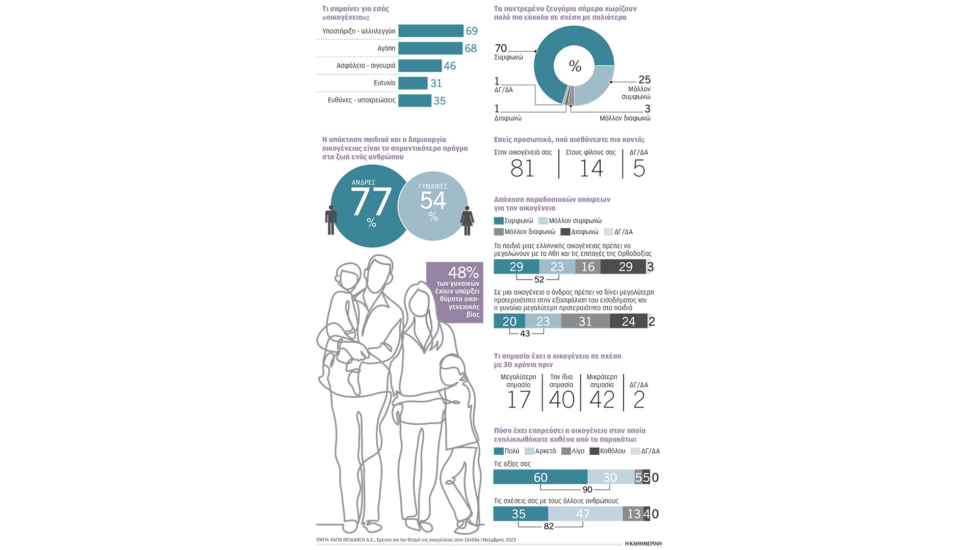 Τι σημαίνει «οικογένεια» για τις Ελληνίδες και τους Ελληνες; Είναι η δημιουργία της ό,τι πιο σημαντικό στη ζωή; Ποιες νέες μορφές της θεωρούν αποδεκτές; Εχει ακόμη απήχηση το τρίπτυχο «πατρίς – θρησκεία – οικογένεια»; Είναι κάποια από τα ερωτήματα στα οποία η εταιρεία ερευνών Kapa Research έψαξε να βρει τις απαντήσεις, μέσω πανελλαδικής έρευνας που διενήργησε τον προηγούμενο μήνα σε σύνολο 917 ανδρών και γυναικών, 17 ετών και άνω, και παρουσιάζει η «Κ». Σύμφωνα με τα αποτελέσματα της δημοσκόπησης, ο θεσμός της οικογένειας παραμένει πολύ σημαντικός για τους πολίτες της χώρας. Παρ’ όλα αυτά, παρατηρείται διαφοροποίηση των αποτελεσμάτων ανάλογα με την ηλικία και το φύλο, με τις γυναίκες να εμφανίζονται λιγότερο συντηρητικές, πιο δεκτικές σε άλλες μορφές οικογένειας, και ίσως να δίνουν πλέον λιγότερη βαρύτητα στη δημιουργία οικογένειας από τους άνδρες.