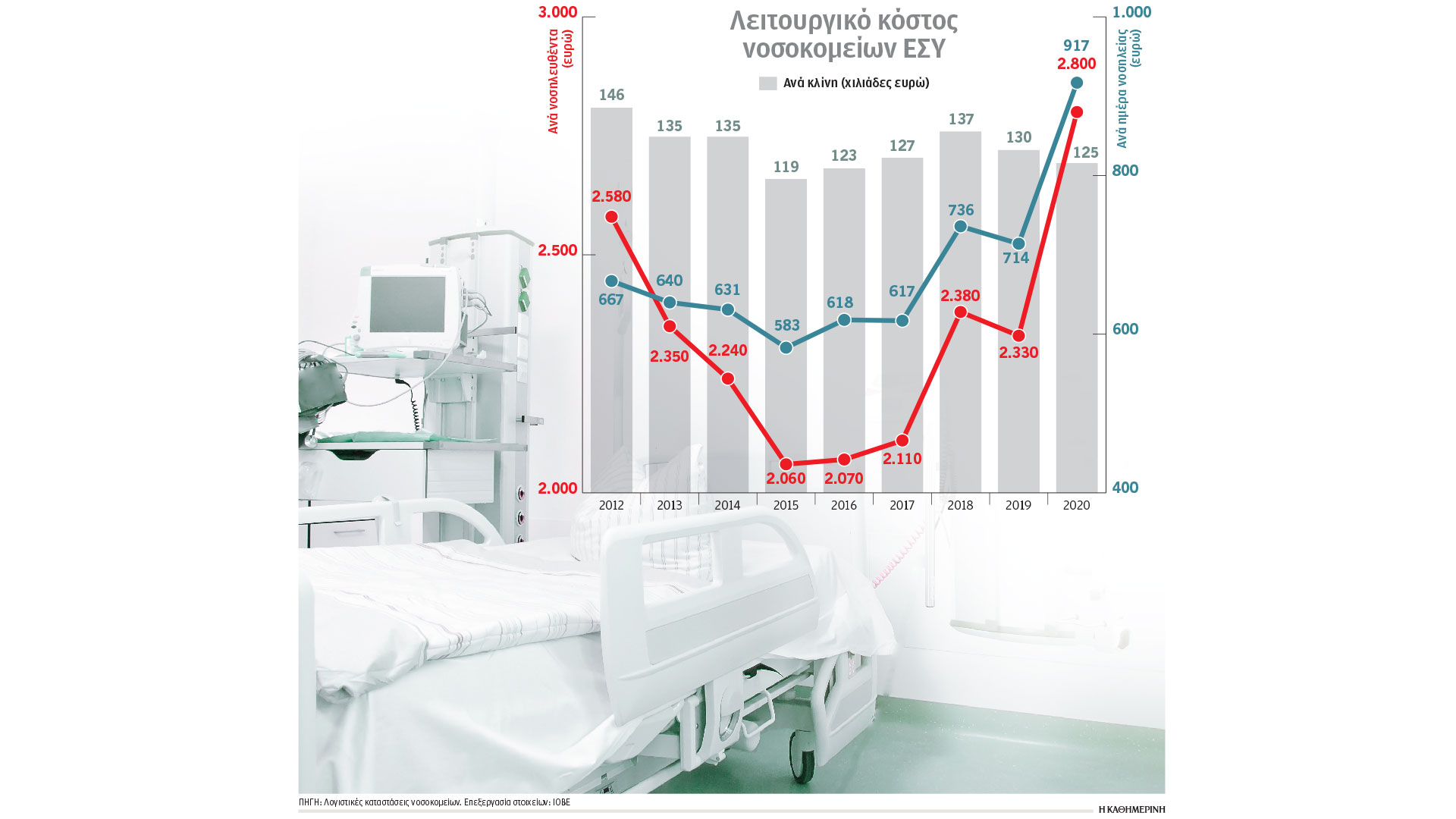 Στον αντίποδα, το λειτουργικό κόστος προς νοσηλευόμενο αυξήθηκε από 2.580 ευρώ το 2012 σε 2.800 το 2020, με την πανδημία να επηρεάζει τον συγκεκριμένο δείκτη, αφού το 2019 το κόστος είχε υποχωρήσει σε 2.330 ευρώ και αυξήθηκε τον πρώτο χρόνο της COVID-19 κατά 20,6%. Ανάλογη είναι και η εικόνα σε ό,τι αφορά το λειτουργικό κόστος των νοσοκομείων ανά ημέρα νοσηλείας, που από 667 ευρώ το 2012 αυξήθηκε στα 917 ευρώ το 2020. Τον τελευταίο χρόνο της μελέτης (2020) η αύξηση ήταν της τάξης του 28,4%.