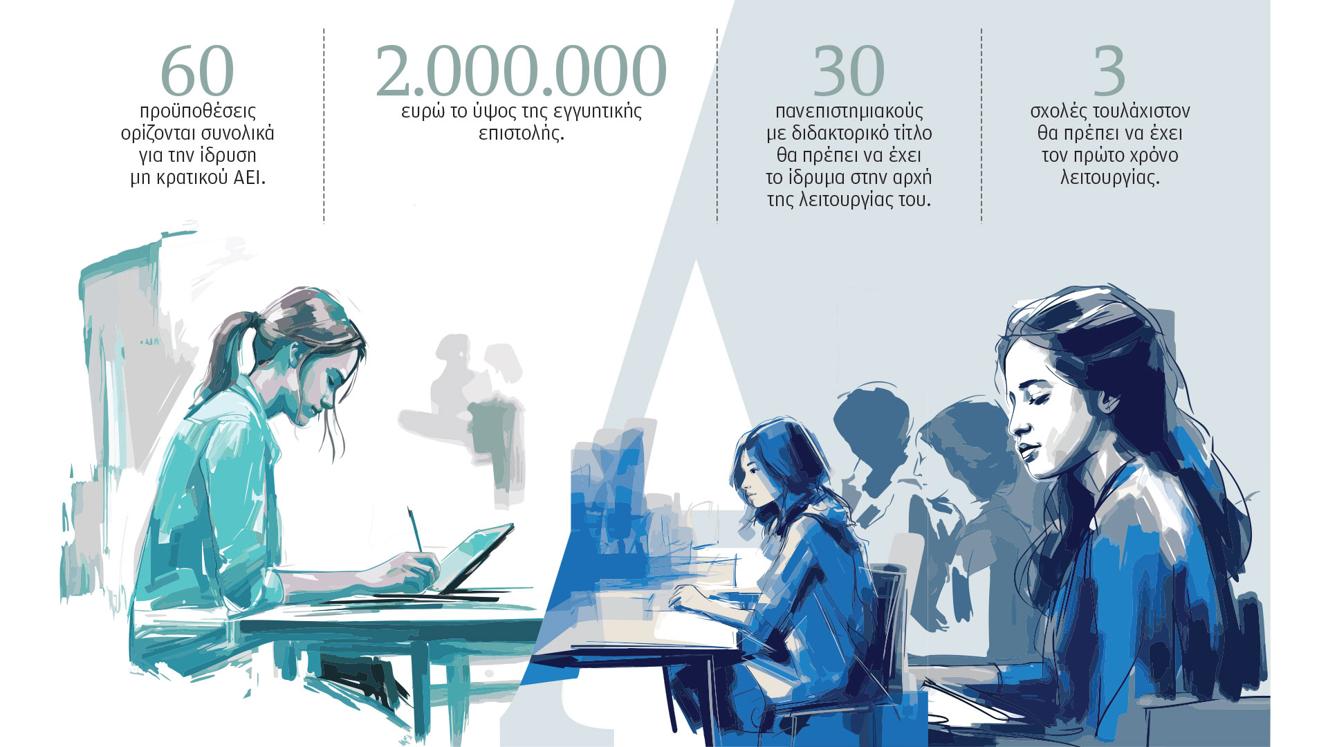 Προφανώς για την ίδρυση και λειτουργία μη κρατικών ΑΕΙ θα υπάρχουν όροι ακαδημαϊκοί (ενδεικτικά στην αρχή της λειτουργίας θα πρέπει να έχουν τουλάχιστον 30 πανεπιστημιακούς με διδακτορικό τίτλο), οικονομικοί (η εγγύηση φθάνει τα δύο εκατομμύρια ευρώ) και κτιριολογικοί. Οι όροι κρίνονται ιδιαιτέρως αυστηροί. Από την πλευρά του, βέβαια, ο αρμόδιος υπουργός εμφανίζεται αισιόδοξος ότι γρήγορα θα βρεθούν ξένα ΑΕΙ που θα θέλουν να επενδύσουν στην Ελλάδα. Χαρακτηριστικά, σε χθεσινές δηλώσεις του σε ΜΜΕ ανέφερε ότι στόχος είναι τα μη κερδοσκοπικά ΑΕΙ να ξεκινήσουν το ακαδημαϊκό έτος 2025-2026, αλλά το πιο πιθανό είναι να δούμε το πρώτο μη κρατικό ΑΕΙ στη χώρα μας πριν από το τέλος της κυβερνητικής τετραετίας, δηλαδή το 2027.