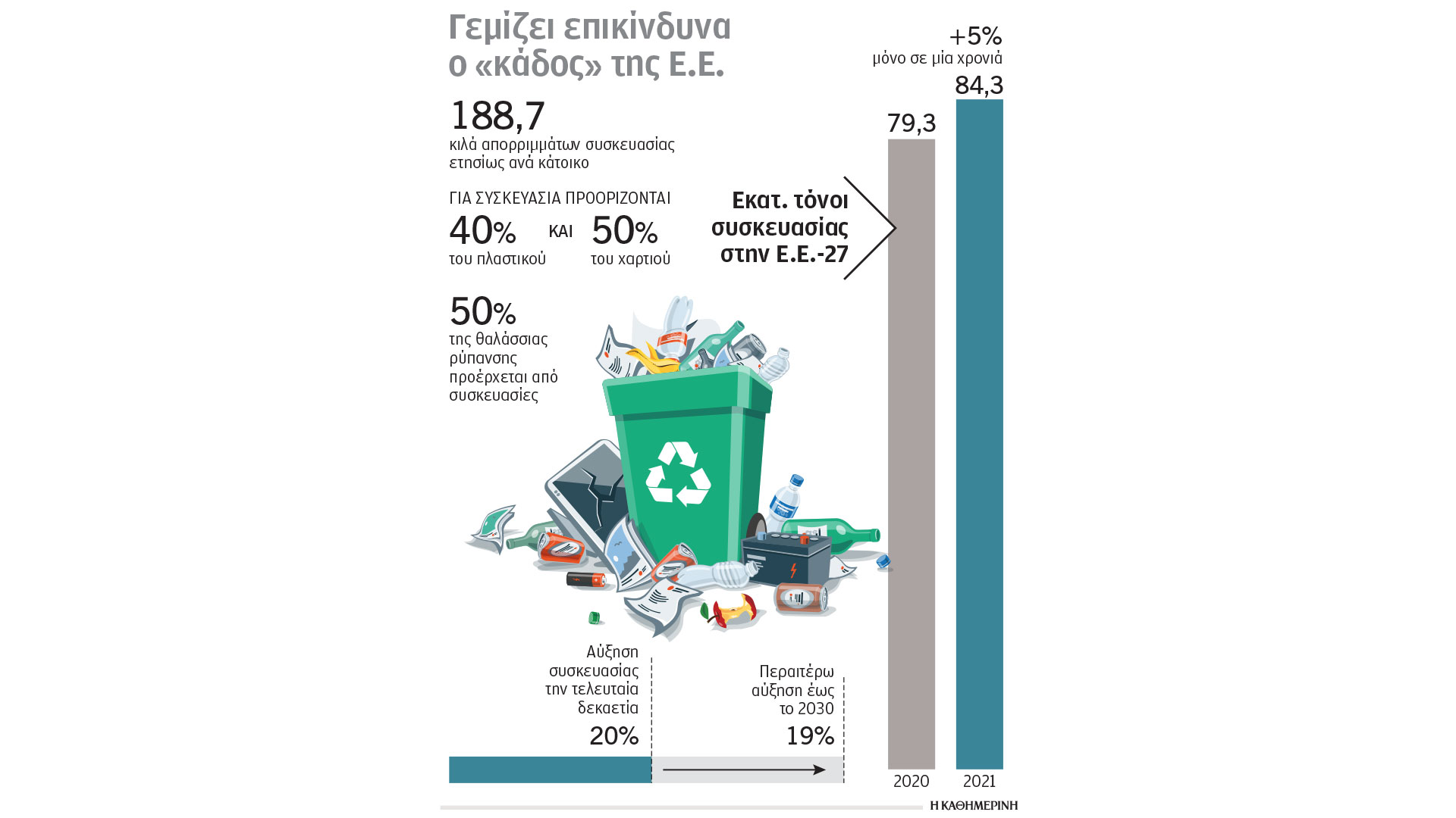 «Παρά την ύπαρξη αυστηρής νομοθεσίας ήδη από το 1994 –η οποία μάλιστα αναθεωρήθηκε το 2018 επί το αυστηρότερον– η κατάσταση παραμένει απογοητευτική», εξηγεί ο νομικός Γιώργος Κωνσταντινόπουλος, ειδικός εμπειρογνώμονας αξιολογήσεων συμμόρφωσης της Ευρωπαϊκής Επιτροπής. «Η συσκευασία αυξήθηκε κατά 20% την τελευταία δεκαετία και αναμένεται περαιτέρω αύξηση 19% έως το 2030. Για τα πλαστικά συσκευασίας, η αναμενόμενη αύξηση είναι 46% έως το 2030 αν δεν ληφθούν μέτρα. Και η αύξηση αυτή αφορά οριζόντια όλα τα υλικά συσκευασίας: χαρτί/χαρτόνι, ξύλο, μέταλλα, γυαλί και πλαστικό. Παρά τις νομοθεσίες, τα μέτρα και τις πρωτοβουλίες που έχουν αναληφθεί, η ανακύκλωση σε επίπεδο Ε.Ε. παραμένει καθηλωμένη».