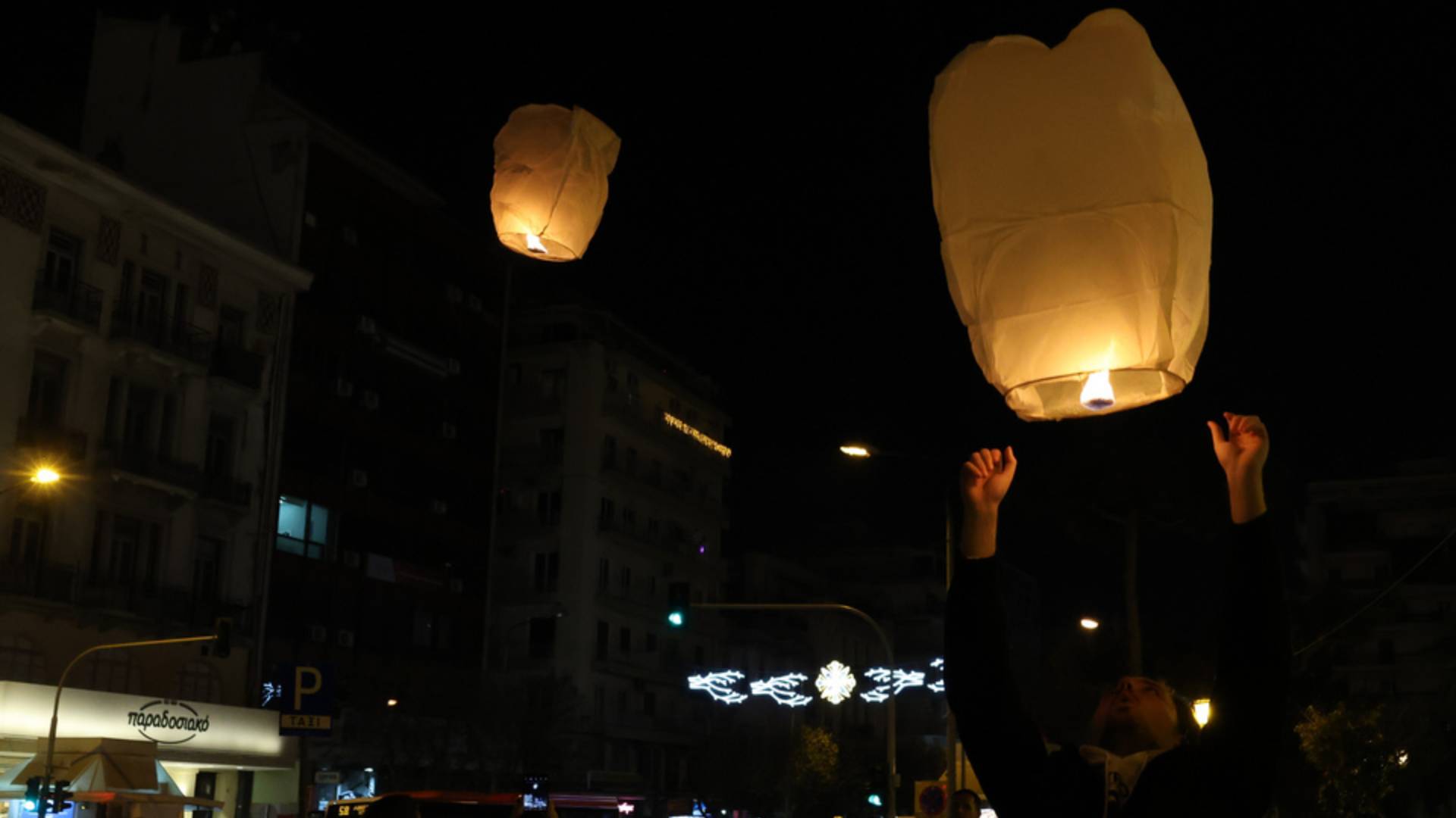Εκατοντάδες φαναράκια υψώθηκαν μετά τις 6 το απόγευμα στον ουρανό της Θεσσαλονίκης, πάνω από τη στολισμένη πλατεία Αριστοτέλους.