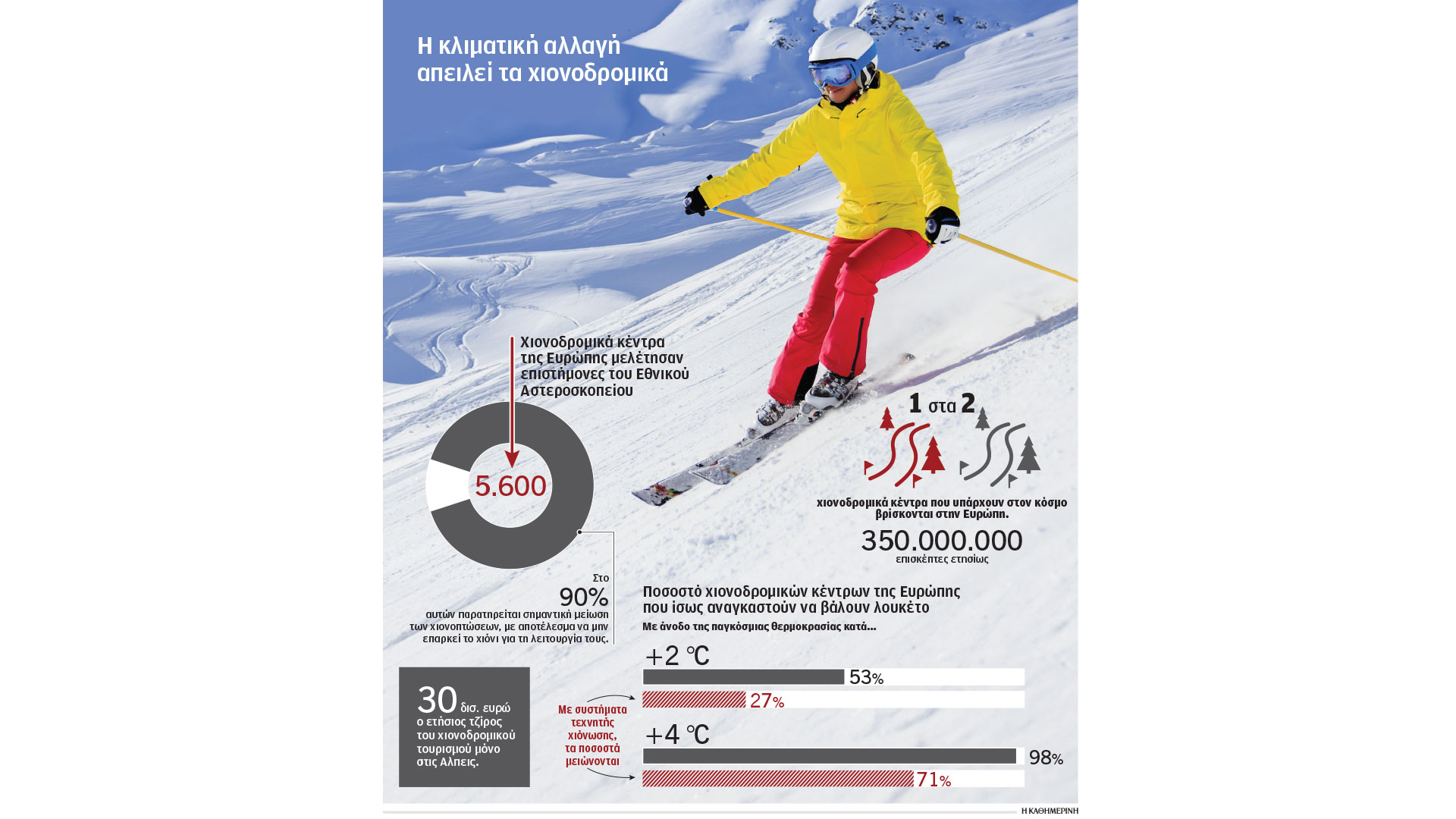 Σε όλη την Ευρώπη, ίδια είναι τα αδιέξοδα. Σημειωτέον ότι η Γηραιά Ηπειρος είναι η μεγαλύτερη αγορά χιονοδρομικού τουρισμού διεθνώς, με περίπου το 50% των χιονοδρομικών κέντρων που υπάρχουν στον κόσμο και περίπου 350 εκατομμύρια επισκέπτες ετησίως. Στις Αλπεις, ο ετήσιος τζίρος αγγίζει τα 30 δισ. ευρώ. Κι όμως, τα θεμέλια αυτής της «αυτοκρατορίας» τρίζουν. Μελέτη Γάλλων και Αυστριακών επιστημόνων που δημοσιεύθηκε πριν από λίγους μήνες στο περιοδικό Nature Climate Change αξιολόγησε τις επιπτώσεις της κλιματικής αλλαγής σε 2.234 χιονοδρομικά κέντρα σε 28 ευρωπαϊκές χώρες. Οι προβλέψεις είναι ζοφερές: με άνοδο της θερμοκρασίας κατά 2 ή 4 βαθμούς Κελσίου, 53% και 98% των χιονοδρομικών κέντρων της Ευρώπης, αντιστοίχως, ίσως αναγκαστούν να βάλουν λουκέτο. Με συστήματα τεχνητής χιόνωσης, τα ποσοστά μειώνονται στο 27% και 71%. Ωστόσο, η τεχνητή παραγωγή χιονιού δεν είναι χωρίς περιβαλλοντικό αντίκτυπο: αυξάνει την κατανάλωση νερού και ηλεκτρικής ενέργειας, κάνοντας ακόμη μεγαλύτερο το αποτύπωμα άνθρακα της βιομηχανίας σκι (βλ. και μεταφορά, καθώς και στέγαση επισκεπτών). Ευθύνεται κατά μέσον όρο για εκπομπή τουλάχιστον 90.000 τόνων διοξειδίου του άνθρακα κάθε χρόνο (ανάλογα με τον τρόπο παραγωγής της ηλεκτρικής ενέργειας).