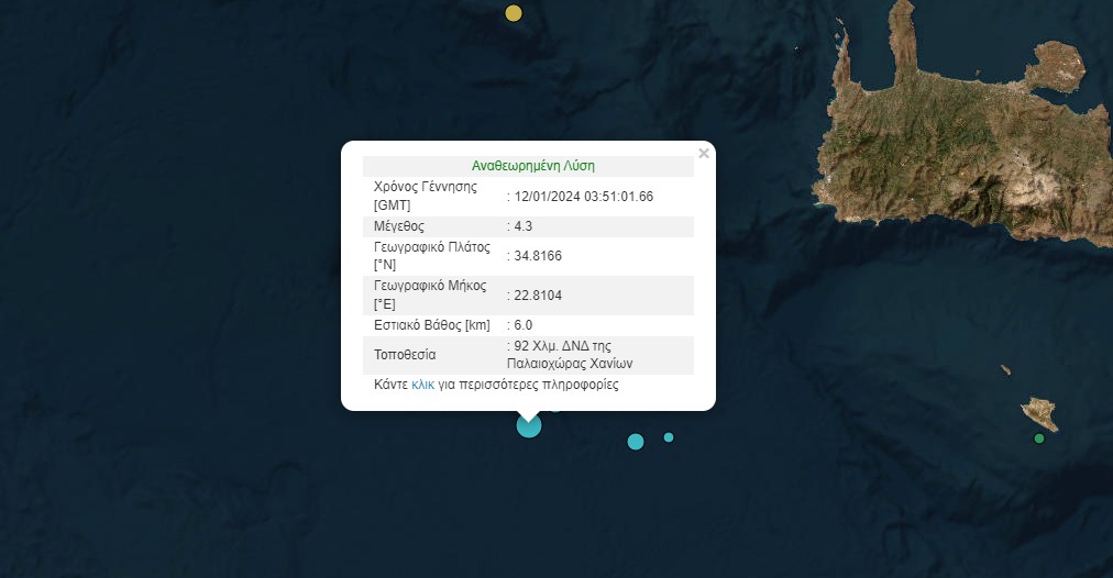Σεισμική δόνηση μεγέθους 4,3 βαθμών της κλίμακας Ρίχτερ σημειώθηκε σήμερα τα ξημερώματα, Παρασκευή, 12 Ιανουαρίου, 92 χλμ. δυτικά-νοτιοδυτικά της Παλαιόχωρας Χανίων.