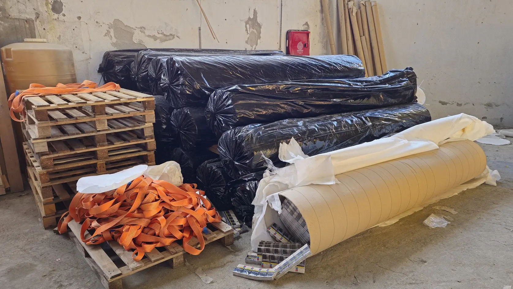 Στο πλαίσιο αστυνομικής επιχείρησης σε αποθήκη που χρησιμοποιούσαν σε περιοχή της Θεσσαλονίκης, εντοπίστηκαν τη στιγμή που φόρτωναν σε φορτηγό όχημα τόπια υφάσματος, που στο εσωτερικό τους έκρυβαν μεγάλες ποσότητες λαθραίων τσιγάρων και με τη χρήση εικονικού τιμολογίου προορίζονταν να μεταφερθούν στο εξωτερικό.