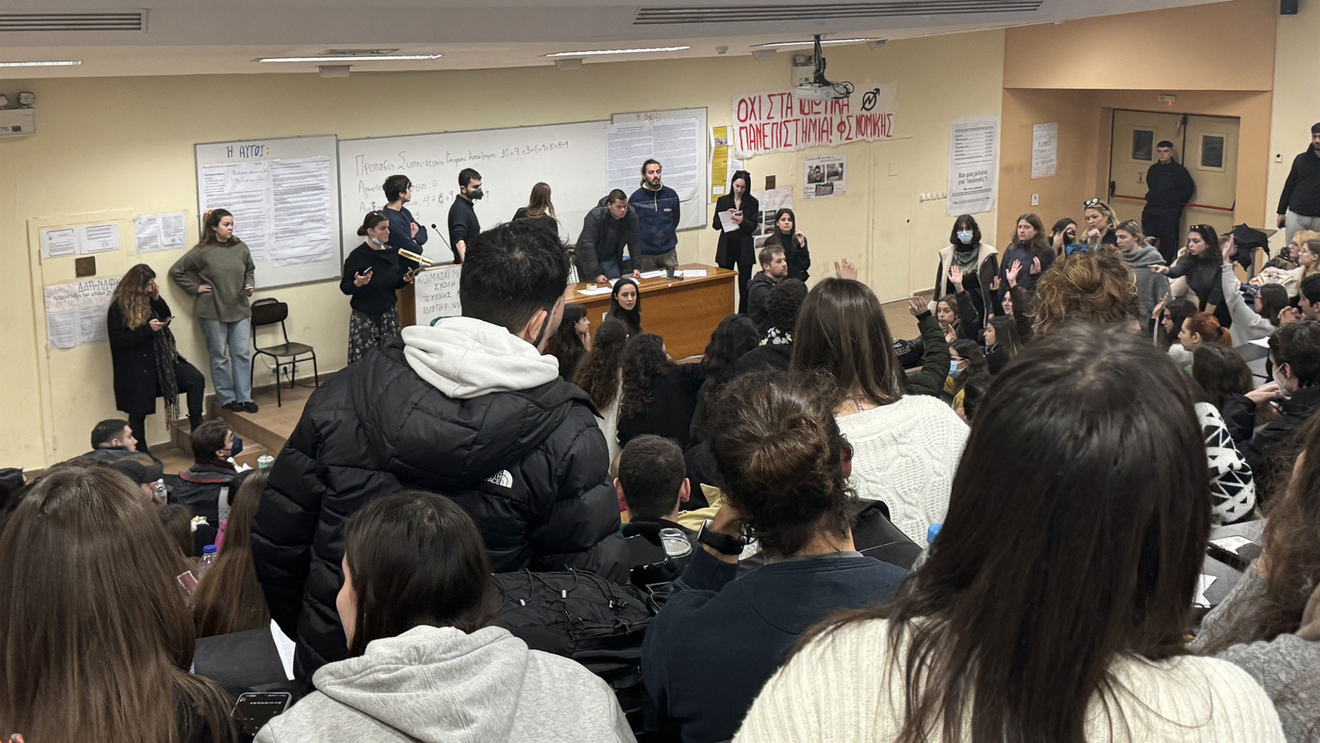 Η ατμόσφαιρα στο αμφιθέατρο δεν θυμίζει σε τίποτε την προηγούμενη συνέλευση, στην οποία είχαν εισβάλει κουκουλοφόροι. Οι μεγάλες φοιτητικές παρατάξεις πάντως –ΔΑΠ-ΝΔΦΚ και ΠΑΣΠ– δεν συμμετέχουν. Είχαν δηλώσει αποχή από τη συνέλευση καταγγέλλοντας τις «συνθήκες βίας, νοθείας, τρομοκρατίας και αριστερόστροφου φασισμού» που είχαν επικρατήσει στην προηγούμενη. Ετσι, διαμορφώνεται μια ατμόσφαιρα ομοιογένειας, με τους «στρατευμένους» φοιτητές να δίνουν τον τόνο μοιράζοντας φυλλάδια και διακηρύσσοντας τους λόγους για τη συνέχιση της κατάληψης. Η ώρα κυλάει στα «πηγαδάκια». Ορισμένοι φοιτητές απολαμβάνουν το τσιγάρο τους, πετώντας τη γόπα στο πάτωμα. Η Ισιδώρα και η Δέσποινα φθάνουν με προκηρύξεις στα χέρια. «Αγχωνόμαστε για την εξεταστική, αλλά τα αιτήματά μας είναι πιο σημαντικά από τα μαθήματα», μας λένε. «Εξάλλου, μην ανησυχείτε, δεν χάθηκε ποτέ η εξεταστική», καθησυχάζουν.