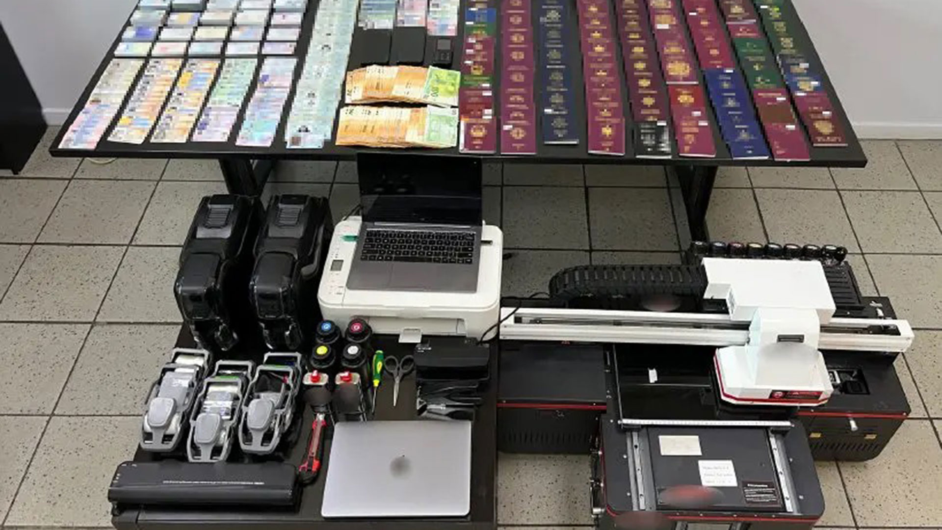 Από την έρευνα που πραγματοποιήθηκε στο πλαίσιο της επιχείρησης, βρέθηκαν και κατασχέθηκαν 800 πλαστικές λευκές κενές κάρτες για κατάρτιση πλαστών εγγράφων, πλήρως καταρτισμένα έγγραφα διαφόρων χωρών (182 δελτία ταυτότητας, 115 διαβατήρια, 21 άδειες διαμονής, 19 άδειες ικανότητας οδήγησης), υπό κατάρτιση πλαστά έγγραφα (374 δελτία ταυτότητας , 275 άδειες παραμονής, 23 κάρτες πολίτη, 5 δελτία αιτούντος ασυλο), επαγγελματικός εκτυπωτής, 2 συσκευές εκτύπωσης και εγχάραξης πλαστικών καρτών, πλαστικοποιητής, 2 συσκευές αποθήκευσης ψηφιακών δεδομένων USB, 2 φορητοί ηλεκτρονικοί υπολογιστές, πλήθος γραφικής ύλης και μικροϋλικών που χρησιμοποιούνται στην κατάρτιση πλαστών εγγράφων, 3 κινητά τηλέφωνα, 12.680 ευρώ και δίκυκλη μοτοσίκλέτα, ως μέσο μεταφοράς διανομής πλαστών εγγράφων.