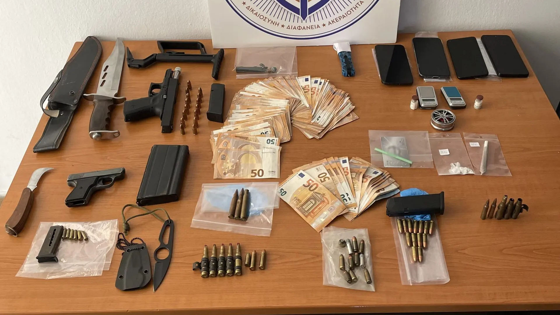 Σε έρευνες που πραγματοποιήθηκαν σε σπίτια των συλληφθέντων βρέθηκαν, μεταξύ άλλων, πιστόλι και γεμιστήρα με 6 φυσίγγια, αυτοσχέδια συσκευασία μεικτού βάρους 122 γραμμαρίων με άγνωστη ουσία, πιθανόν εκρηκτική ύλη, 2 γεμιστήρες (πολεμικού τυφεκίου και όπλου χειρός), 2 μαχαίρια πολεμικού τύπου και σουγιάς.