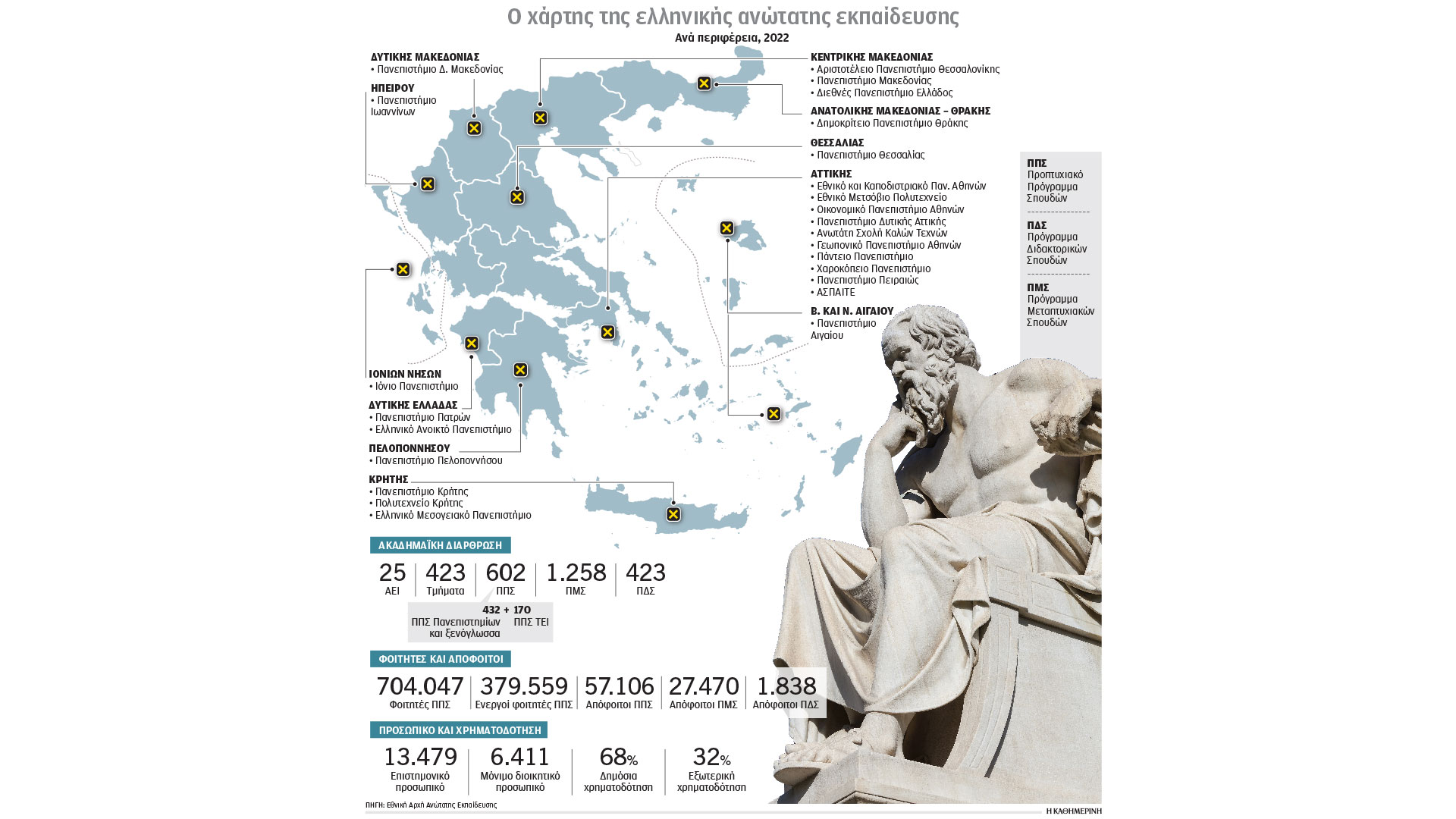 • Στα ΑΕΙ εργάζονται 10.152 μόνιμοι καθηγητές και 3.327 ειδικό διδακτικό και τεχνικό προσωπικό, καθώς και 6.411 μόνιμοι διοικητικοί υπάλληλοι.