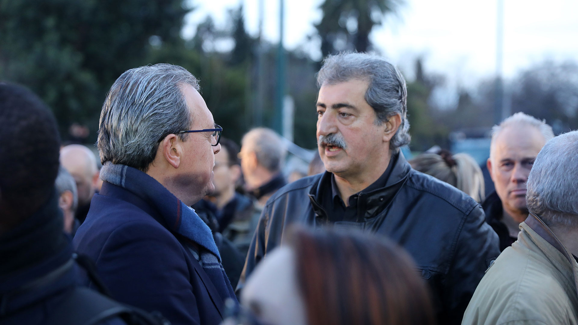 Ο Σωκράτης Φάμελλος και ο Παύλος Πολάκης συνομιλούν ενώ συμμετέχουν στο συλλαλητήριο των αγροτών στην πλατεία Συντάγματος.