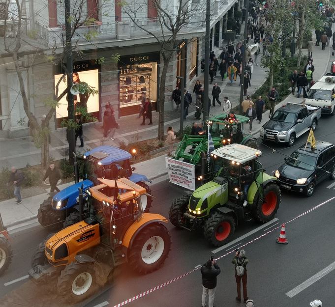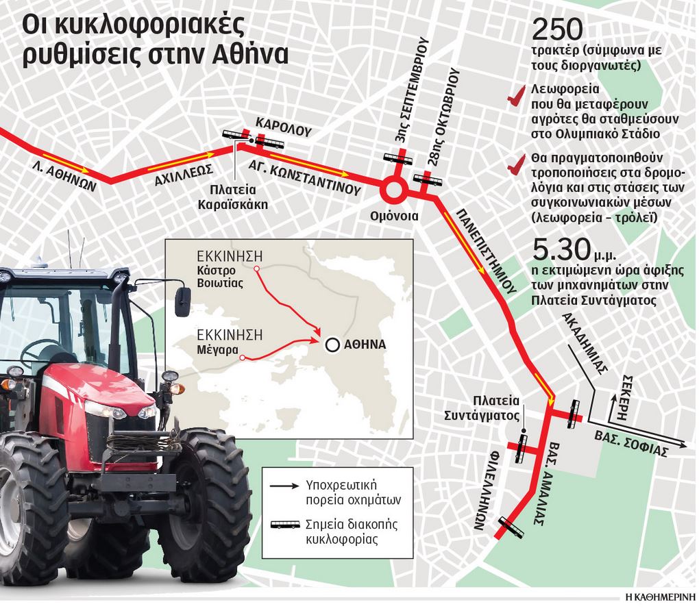 «Λόγω της κίνησης των αγροτών προς το κέντρο της Αθήνας, σας ενημερώνουμε ότι μέσα στην επόμενη ώρα η Τροχαία συμπληρωματικά θα εφαρμόσει κυκλοφοριακές ρυθμίσεις προκειμένου να πραγματοποιηθεί με ασφάλεια τόσο η μετακίνηση των αγροτών όσο και η κίνηση των υπόλοιπων πολιτών στην περιοχή. Ειδικότερα, θα υπάρξουν κυκλοφοριακές ρυθμίσεις μετά τη λεωφόρο Αθηνών και στον οδικό άξονα που περιλαμβάνει τις οδούς Δεληγιώργη, Πειραιώς, Σταδίου, Φιλελλήνων και Ξενοφώντος. Την ίδια στιγμή, λόγω της κίνησης δεύτερης ομάδας τρακτέρ κατά μήκος του προγραμματισμένου δρομολογίου, σε ισχύ τίθεται διακοπή κυκλοφορίας των οχημάτων στις οδούς Αγίου Κωνσταντίνου και Πανεπιστημίου. Παρακαλούνται οι πολίτες να αποφύγουν τη μετακίνησή τους στους ανωτέρω οδικούς άξονες μέχρι την ολοκλήρωση των κινητοποιήσεων», ανέφερε το μεσημέρι η ενημέρωση της Αστυνομίας.