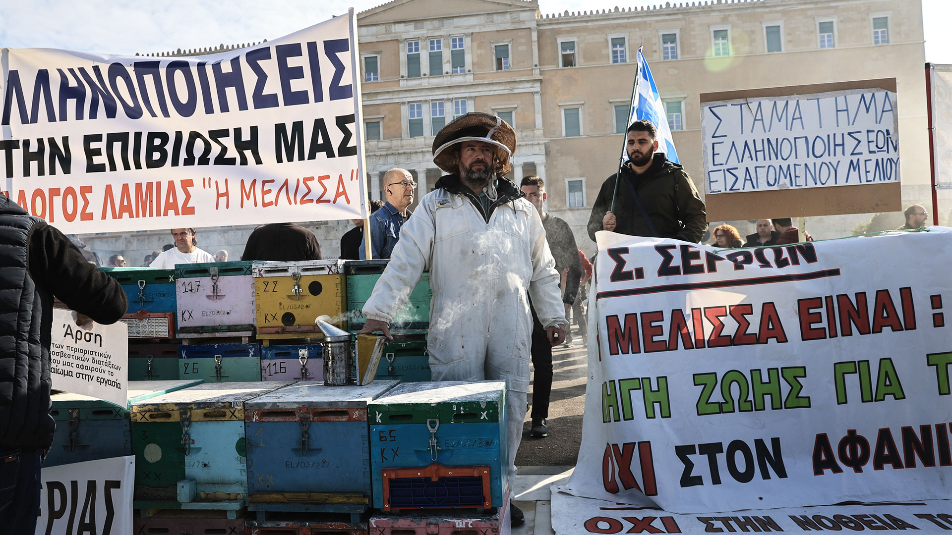 Αυτά είναι που έφεραν μελισσοκόμους και κυψέλες μπροστά στη Βουλή χθες. «Υπήρχαν προβλήματα, ήρθε και η κλιματική αλλαγή και μας άλλαξε τα φώτα», λέει χαρακτηριστικά η κ. Φανή Χατζήνα, διευθύντρια ερευνών στο Τμήμα Μελισσοκομίας του ΕΛΓΟ-Δήμητρα. «Εύβοια, Ρόδος, Αττική, Εβρος, οι μελισσοκόμοι έχουν πάθει τεράστιες καταστροφές. Είναι πολύ δύσκολο σήμερα να είσαι μελισσοκόμος. Η τιμή που παίρνει ο παραγωγός έχει μείνει στάσιμη εδώ και πολλά χρόνια, ενώ τα έξοδα παραγωγής έχουν αυξηθεί κατά πολύ», περιγράφει. Η τιμή που οι μελισσοκόμοι πωλούν το μέλι τους στους συσκευαστές είναι από 2,5 ευρώ έως 4,50 ευρώ το κιλό ανάλογα την ποιότητα. Λόγω του ανταγωνισμού που υπάρχει για τα μέρη όπου βόσκουν οι μέλισσες, τα οποία διαρκώς περιορίζονται, η παραγωγή ενός μελισσιού δεν μπορεί να αυξηθεί έτσι ώστε να δώσει μεγαλύτερο εισόδημα στον παραγωγό. Στην Ελλάδα υπολογίζεται ότι υπάρχουν περίπου 1,5 εκατ. κυψέλες και 25.000 μελισσοπαραγωγοί. Ωστόσο η Ελλάδα έχει τον μεγαλύτερο αριθμό μελισσοσμηνών ανά τετραγωνικό μέτρο στην Ε.Ε.
