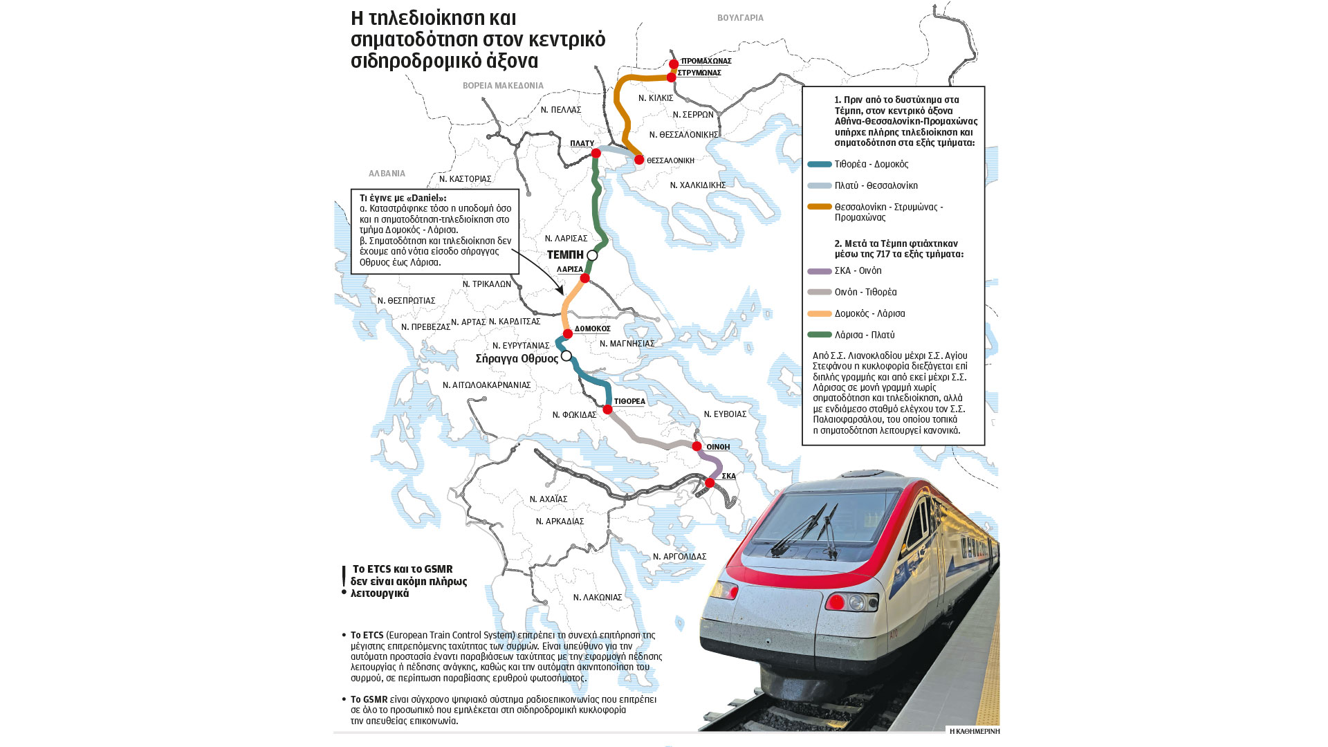 Βυθισμένος στον βούρκο του «Daniel» αλλά και στην απαξίωση βρέθηκε ο ελληνικός σιδηρόδρομος τα τελευταία χρόνια, με τους εμπλεκόμενους φορείς να σπεύδουν, μετά το δυστύχημα στα Τέμπη, να διορθώσουν παθογένειες και αμέλειες του παρελθόντος. Ενα χρόνο μετά, και με εξαίρεση τμήματα που επλήγησαν από τον «Daniel», η κατάσταση του δικτύου είναι βελτιωμένη –τουλάχιστον στον κεντρικό άξονα, αφού δεν συμβαίνει το ίδιο με άλλα προβληματικά σημεία του σιδηροδρόμου– μετά και την ολοκλήρωση των έργων της σύμβασης 717. Παραμένουν ωστόσο σημαντικές εκκρεμότητες για την πλήρη λειτουργία και ανάπτυξη του συστήματος ETCS, του επιπρόσθετου συστήματος ασφαλείας της κυκλοφορίας των τρένων και του πιο σύγχρονου ψηφιακού δικτύου επικοινωνίας, GSMR.