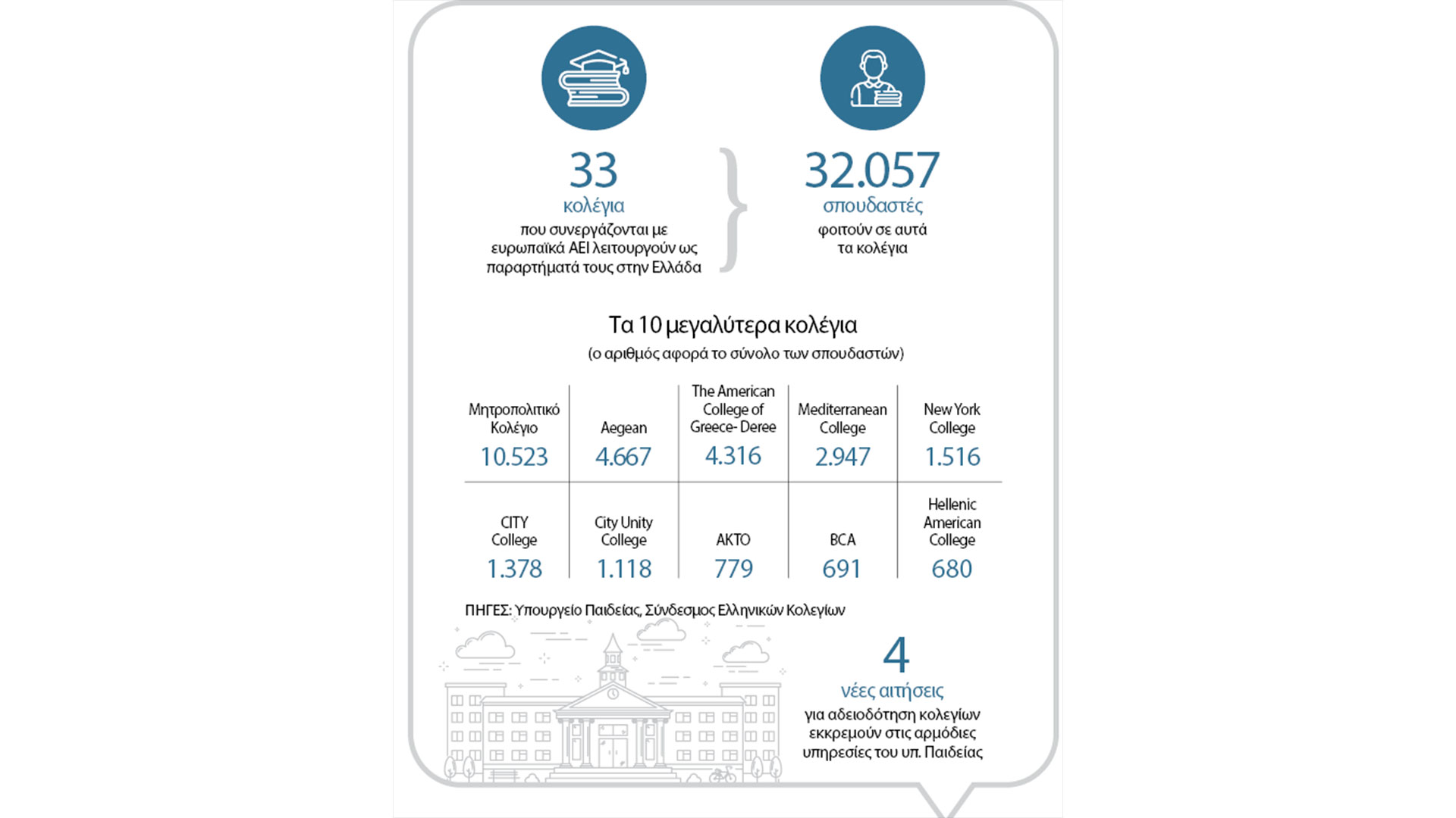 Συνολικά 32.057 σπουδαστές φοιτούν στα 33 ελληνικά κολέγια που συνεργάζονται με ευρωπαϊκά ΑΕΙ και λειτουργούν ως παραρτήματά τους στη χώρα μας. Η συντριπτική πλειονότητά τους έχει συνεργασίες με βρετανικά ΑΕΙ, τα προγράμματα σπουδών των οποίων υλοποιούν στην Ελλάδα. Εξ ου και ότι το πτυχίο απονέμεται από το ευρωπαϊκό ΑΕΙ και όχι από το ιδιωτικό κολέγιο.