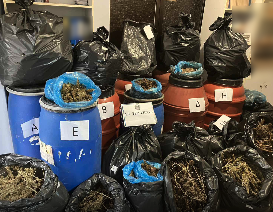Βαρέλια και σακούλες που περιείχαν συνολικά 48 κιλά και 880 γραμμάρια ακατέργαστης κάνναβης εντοπίστηκαν σε διάφορα σημεία εντός οικοπέδου στην Τροιζήνα.