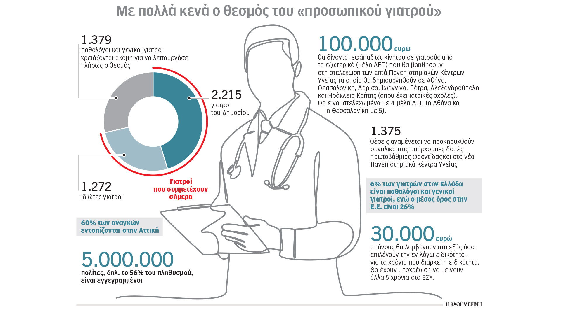 Οι λόγοι που ο προσωπικός γιατρός δεν κέρδισε την εμπιστοσύνη ούτε των ασθενών ούτε των γιατρών ήταν πολλοί. Οι παθολόγοι και γενικοί ιατροί στην Ελλάδα είναι αναλογικά πολύ λίγοι – μόλις το 6% του συνόλου, όταν ο ευρωπαϊκός μέσος όρος είναι 26%. «Η Πορτογαλία που έχει οικοδομήσει αξιόλογη Πρωτοβάθμια Φροντίδα Υγείας έχει πλήθος παθολόγων, 40% του συνόλου», επεσήμανε η αναπληρώτρια υπουργός Υγείας Ειρήνη Αγαπηδάκη, που έχει αναλάβει το χαρτοφυλάκιο της Πρωτοβάθμιας Φροντίδας. Για να καταστεί πιο ελκυστική μια ειδικότητα, που ανέκαθεν δεν κέντριζε το ενδιαφέρον των φοιτητών Ιατρικής, το υπουργείο δρομολογεί ένα γενναιόδωρο χρηματικό μπόνους ύψους 30.000 ευρώ ετησίως – για όσα χρόνια διαρκεί η ειδικότητα (σ.σ. έως σήμερα είναι 5ετής) με τη δέσμευση ότι οι εκκολαπτόμενοι παθολόγοι θα παραμείνουν εν συνεχεία ίσο αριθμό ετών στο ΕΣΥ.
