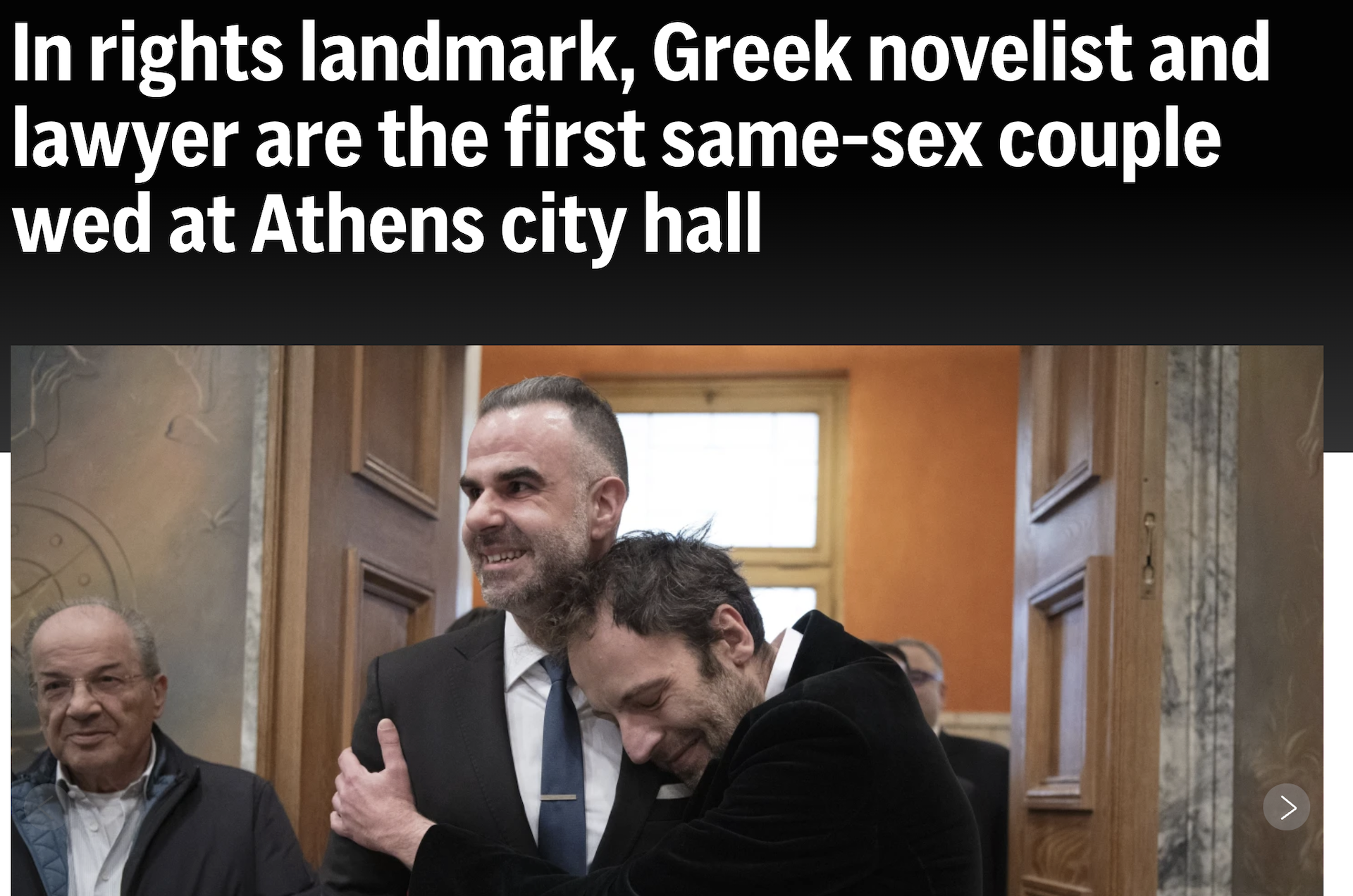 «Ο μυθιστοριογράφος και ο δικηγόρος είναι το πρώτο ομόφυλο ζευγάρι που παντρεύτηκε στο δημαρχείο της Αθήνας», σημειώνει το πρακτορείο Associated Press, κάνοντας λόγο για μια εξέλιξη που αποτελεί «ορόσημο για τα δικαιώματα».