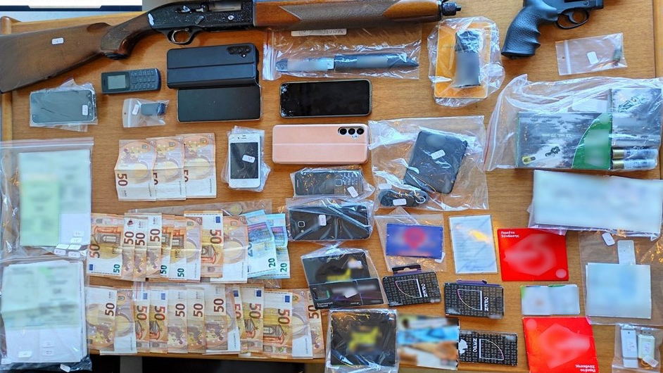 Από τις έρευνες που πραγματοποιήθηκαν στα οχήματα, στις οικίες τους καθώς και από την κατοχή τους, βρέθηκαν και κατασχέθηκαν μεταξύ άλλων: ένα περίστροφο κρότου, ένα μαχαίρι, μια κυνηγετική καραμπίνα, 18 φυσίγγια, τέσσερις τραπεζικές επιταγές, τρεις ηλεκτρονικές συσκευές αποθήκευσης δεδομένων, χρηματικά ποσά, και πλήθος καρτών τηλεφωνικών συνδέσεων και κινητών τηλεφώνων. Επιπλέον, κατασχέθηκαν τρία οχήματα ως μέσα τέλεσης αξιόποινων πράξεων.