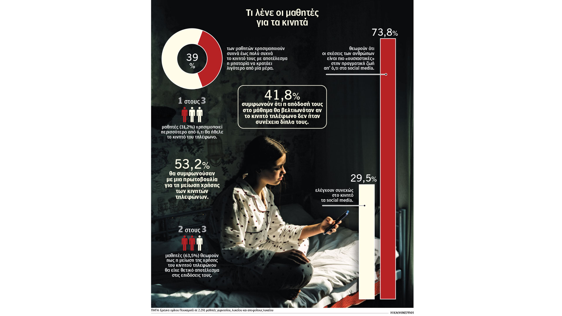 Η έρευνα του ομίλου «Πουκαμισά» σε 2.291 μαθητές γυμνασίου, λυκείου και αποφοίτους λυκείου (η έρευνα έγινε το διάστημα 7-19.02.24, με τη συνδρομή του στατιστικού Κωνσταντίνου Αποστολάκη), που παρουσιάζει σήμερα η «Κ», αποτυπώνει τις απόψεις των εφήβων για τις σχέσεις τους με το κινητό τηλέφωνο και τις επιπτώσεις στη ζωή τους, εντός και εκτός σχολείου.
