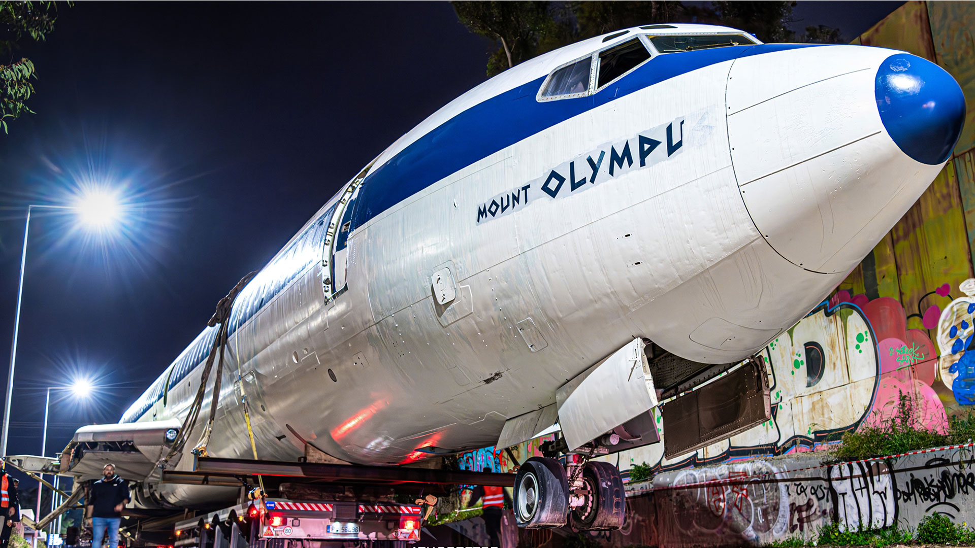 Ο παλιός αεροδιάδρομος του Ελληνικού θυμίζει λίγο κάποιο ατακτοποίητο δωμάτιο, όπου ένα παιδί έχει αφήσει τα παιχνίδια του ασυναρμολόγητα. H ουρά ενός Boeing 727 είναι δεμένη με κίτρινα σχοινιά πάνω σε μια πράσινη πλατφόρμα με μαύρες ρόδες. Το ίδιο και η μακρόστενη μύτη του με το μπλε ράμφος, το λευκό σώμα. Στο πλάι δεξιά, στο ύψος του πιλοτηρίου, κάποτε έγραφε «Mount Olympus» – τώρα λείπει το τελευταίο «s». Στην ουρά, οι έξι κρίκοι υπάρχουν ακόμη, αν και δεν έχουν όλοι διατηρήσει τα χρώματά τους. Το λογότυπο όμως, κι ας έχουν περάσει περίπου 56 χρόνια από όταν το αεροπλάνο παραδόθηκε στον Αριστοτέλη Ωνάση, και 24 από όταν σταμάτησε να πετάει, είναι σαν να μην το άγγιξε ο χρόνος. «Olympic», γράφει.