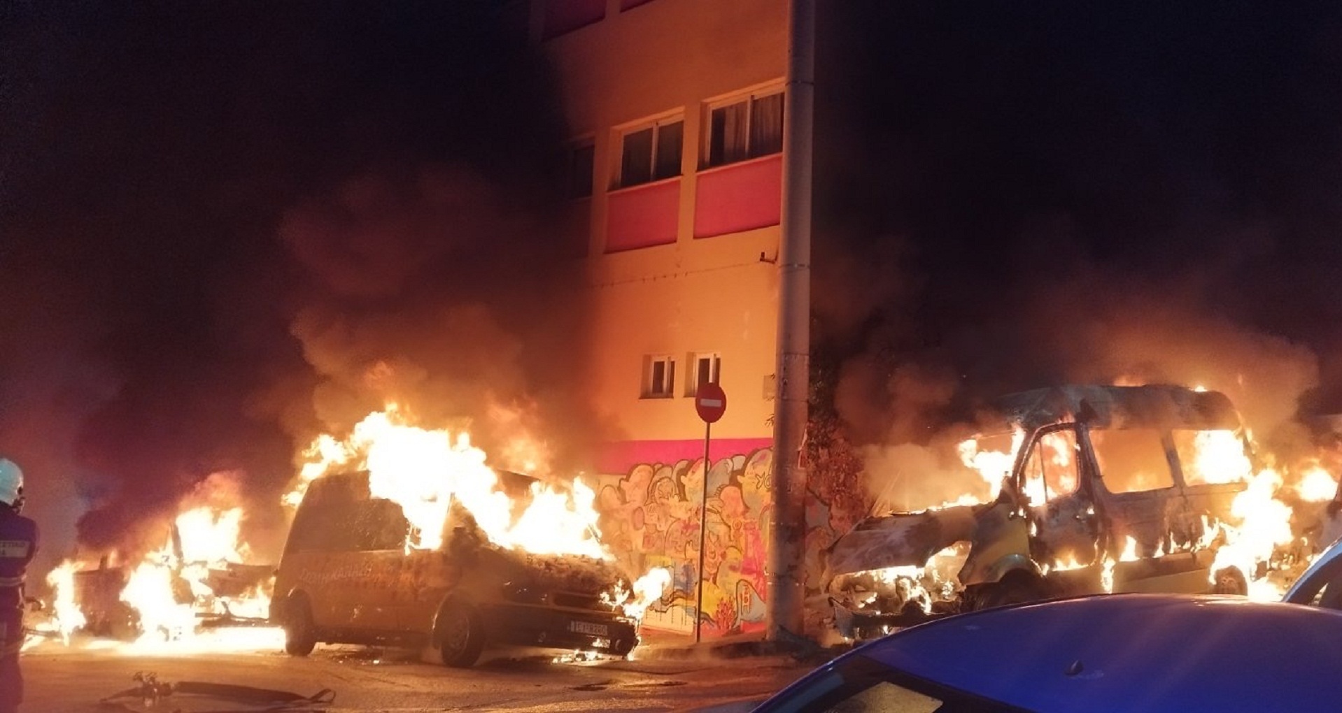 Το αποτέλεσμα είναι να έχουν καεί τουλάχιστον πέντε σχολικά, έξι Ι.Χ. αυτοκίνητα και τρεις μοτοσικλέτες.