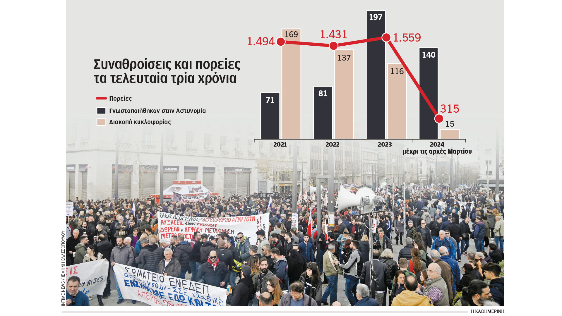 Παρόμοια ήταν η εικόνα και το 2023, με τους δρόμους του κέντρου να κλείνουν 50 φορές για διαδηλώσεις κάτω των 50 διαδηλωτών. Τα στελέχη της ΕΛ.ΑΣ. πάντως που ρωτήθηκαν σχετικά, βλέπουν το ποτήρι «μισογεμάτο». Λένε δηλαδή ότι στην πλειονότητα των μικρών και μεσαίων διαδηλώσεων λαμβάνονται μέτρα για να μην αναστατώνεται πλήρως η ζωή και η εμπορική δραστηριότητα στην πρωτεύουσα, καθώς και ότι ορισμένες κατηγορίες διαδηλωτών –κυρίως οι επικεφαλής συνδικάτων– κοινοποιούν εγκαίρως τα σχέδιά τους στην ΕΛ.ΑΣ. Ως πρόσφατο θετικό παράδειγμα αναφέρουν τη διαχείριση των κινητοποιήσεων των αγροτών στην πλατεία Συντάγματος.