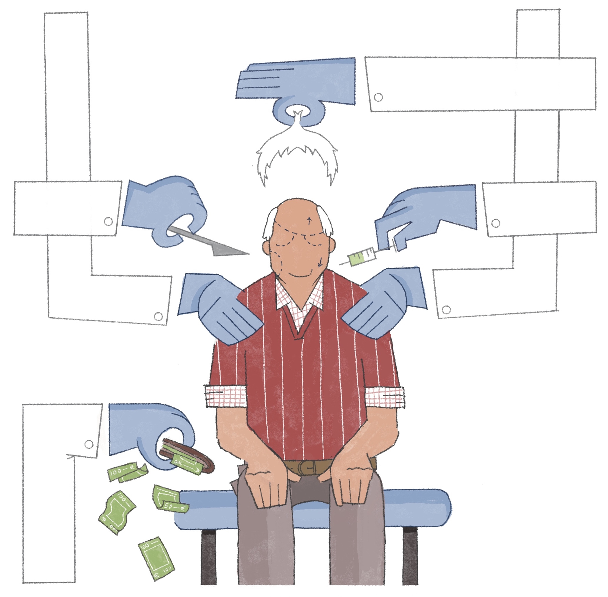 Κρέμες, νοιάξιμο, έγγραφα προς υπογραφή. Πλέον το περιβάλλον ήταν οικείο για τον κ. Πέτρο. Ενιωθε ευχάριστα πηγαίνοντας εκεί, απολαμβάνοντας την περιποίηση, τη φροντίδα, την ασφάλεια. Ηταν λοιπόν τεράστιο σοκ για τον ίδιο όταν στο ραντεβού της 23ης Ιανουαρίου, αφού του παρασχέθηκαν υπηρεσίες βλεφαροπλαστικής, για πρώτη φορά τον ενημέρωσαν πως οφείλει 1.000 ευρώ για την «ιατρική παρακολούθηση», την οποία είχε δεχθεί ως επιπλέον υπηρεσία η οποία δεν περιλαμβανόταν στο πρόγραμμα θεραπειών. Ο ηλικιωμένος άνδρας αιφνιδιάστηκε. Του είπαν πως η οφειλή είναι πραγματική και ότι όλα γίνονται για το καλό της υγείας του. Τον έπεισαν ότι ήταν κάτι που του είχαν εξηγήσει και ο ίδιος δεν είχε καταλάβει. Τους είπε ότι δεν έχει μαζί του αυτά τα χρήματα και τους ζήτησε να τον περιμένουν να πάει στο σπίτι του να τα πάρει. Τότε μια από τις ευγενικές υπαλλήλους του κέντρου αισθητικής προθυμοποιήθηκε να τον συνοδέψει έως το σπίτι με το ταξί προκειμένου να της δώσει τα χρήματα. Του έκλεισε και το επόμενο ραντεβού, για τις 25/1, στο οποίο όπως του είπε έπρεπε οπωσδήποτε να έχει μαζί του 500 ευρώ μετρητά. «Εχετε δεχθεί πολλές επιπλέον υπηρεσίες πέραν της προσφοράς, κ. Πέτρο».