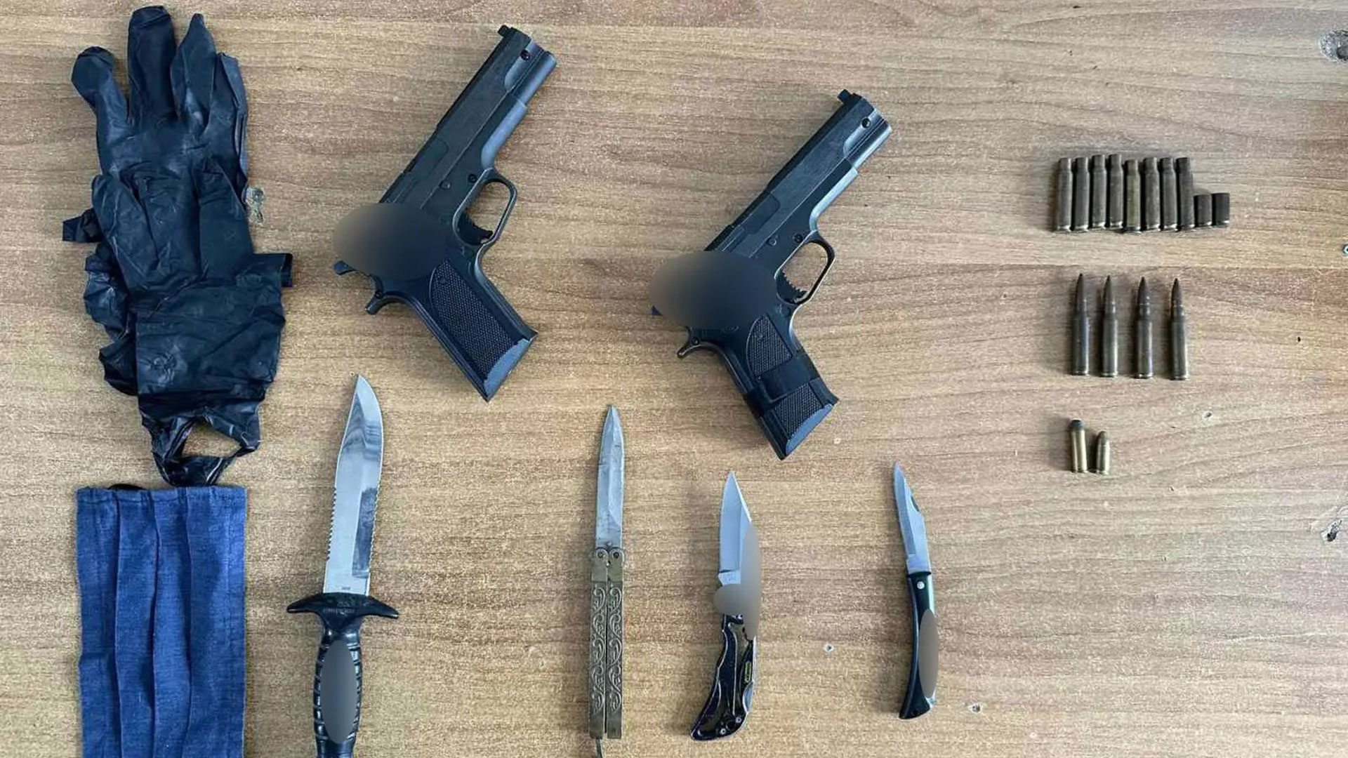 Από τις έρευνες των Αρχών στον 43χρονο καθώς και στο αυτοκίνητό του, εντοπίστηκαν αεροβόλο πιστόλι, 10 κάλυκες, 6 φυσίγγια, 3 κενές αμπούλες, πλήθος μεταλλικών σφαιριδίων αεροβόλου όπλου εντός μεταλλικού κυτίου, 4 μαχαίρια και ρουχισμός.