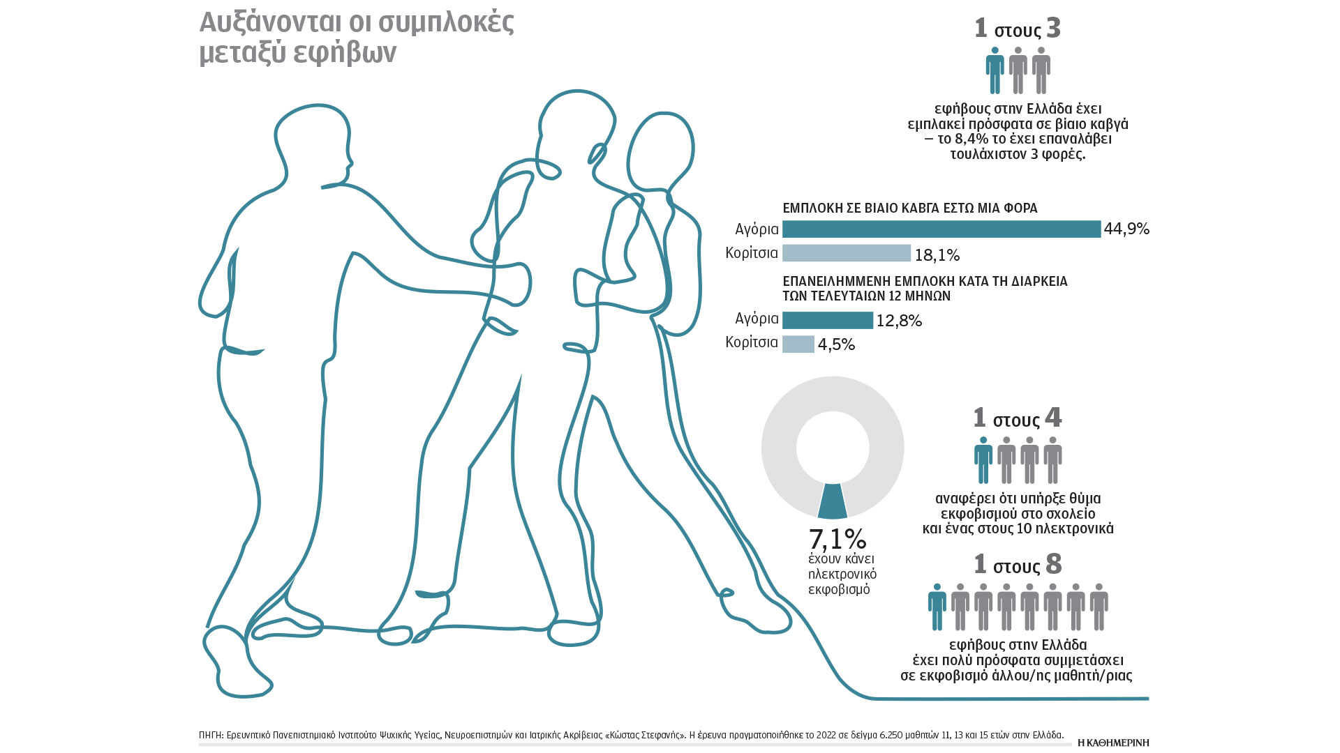Μεγαλύτερη ένταση στις βίαιες συγκρούσεις μεταξύ των εφήβων και έξαρση του ψηφιακού εκφοβισμού αναδεικνύει, μεταξύ άλλων, η «Πανελλήνια Ερευνα για τις Συμπεριφορές που Συνδέονται με την Υγεία των Εφήβων- μαθητών», που πραγματοποίησε το ΕΠΙΨΥ (Ερευνητικό Πανεπιστημιακό Ινστιτούτο Ψυχικής Υγείας, Νευροεπιστημών και Ιατρικής Ακρίβειας «Κώστας Στεφανής») το 2022 σε δείγμα 6.250 μαθητών 11, 13 και 15 ετών στην Ελλάδα. Περίπου ένας στους τρεις (30,7%) δήλωσε ότι ενεπλάκη σε βίαιο καβγά τον τελευταίο ένα χρόνο και μάλιστα στις 8,4% των περιπτώσεων η συμπλοκή συνέβη τουλάχιστον τρεις φορές κατά την ίδια χρονική περίοδο. «Τα τελευταία οκτώ χρόνια, μειώνεται το ποσοστό των εφήβων που αναφέρουν εμπλοκή σε καβγάδες και μάλιστα το 2022 έφτασε στη χαμηλότερη τιμή της τελευταίας 20ετίας», σχολιάζει στην «Κ» ο επιστημονικά υπεύθυνος της μελέτης, Αναστάσιος Φωτίου. Το εύρημα προκαλεί έκπληξη έπειτα από το πλήθος των βίαιων συμβάντων μεταξύ εφήβων τους τελευταίους μήνες, που έχουν σοκάρει την κοινή γνώμη, ενώ έχουν ενεργοποιήσει τα αντανακλαστικά της ΕΛ.ΑΣ. και του υπουργείου Παιδείας. Πώς εξηγείται; «Υπάρχει μια λεπτή διαφορά», απαντά ο κ. Φωτίου. «Οσοι δηλώνουν ότι είναι θύτες είναι λιγότεροι αριθμητικά, ωστόσο εκδηλώνουν χειρότερης μορφής βία, εξ ου και τα συμβάντα παίρνουν δημοσιότητα· επίσης έχουν περισσότερο από ένα θύματα», εξηγεί. Αυτή η πτυχή της βίαιης συμπεριφοράς έχει πολλές αναγνώσεις. «Οι έφηβοι σήμερα εκτίθενται μέσω των social media σε πολλά βίντεο με ωμή βία, τα οποία μπορεί να μην έχουν καν οι ίδιοι αναζητήσει», παρατηρεί ο ίδιος. Υποδόρια μηνύματα λαμβάνουν επίσης από τη δημοφιλή μουσική trap, που αναπαράγει ρατσιστική και ομοφοβική ρητορική, αλλά και από τον συχνά βίαιο λόγο στους κόλπους της οικογένειας.